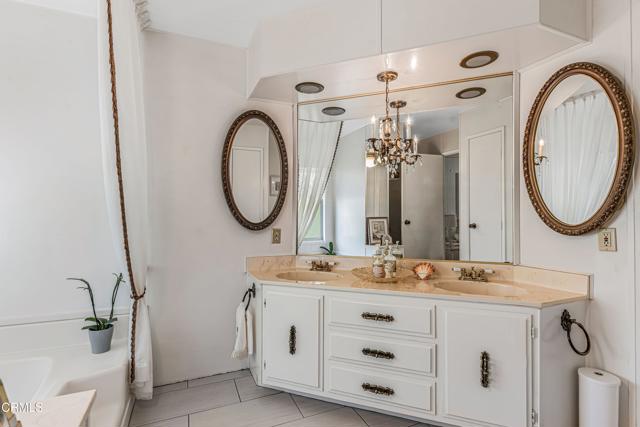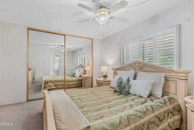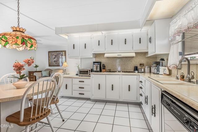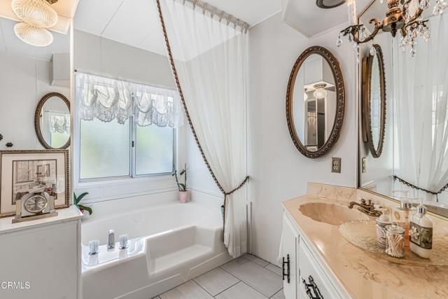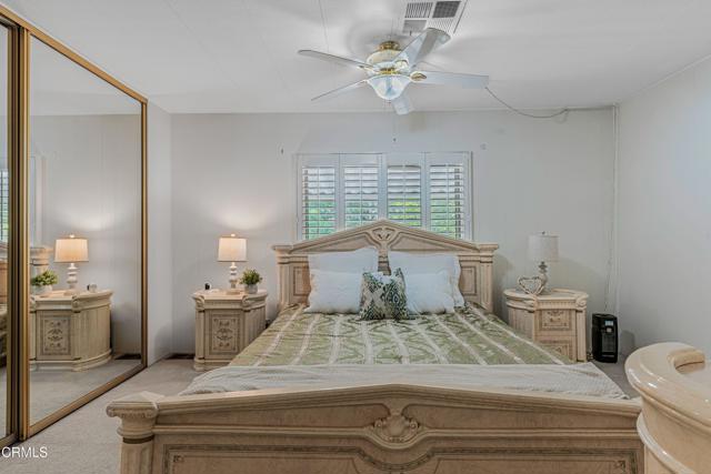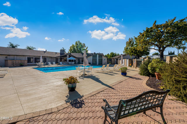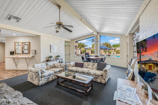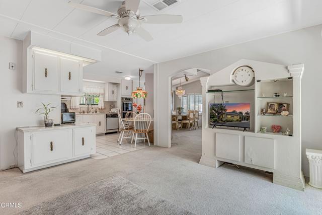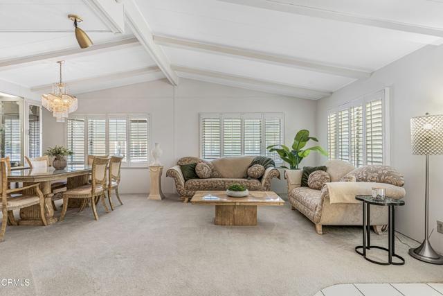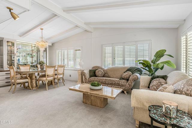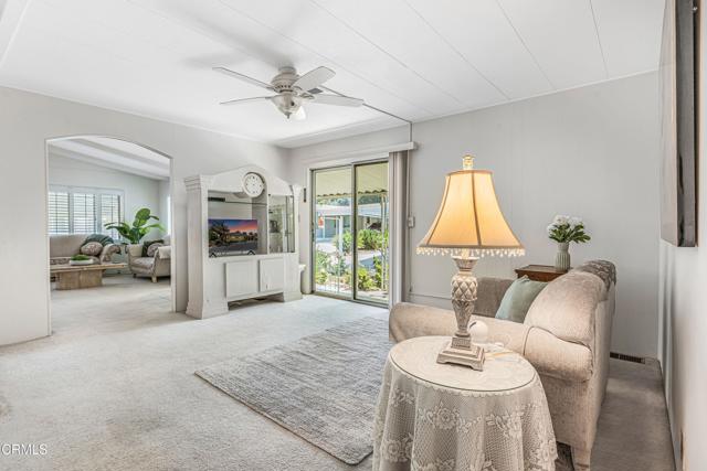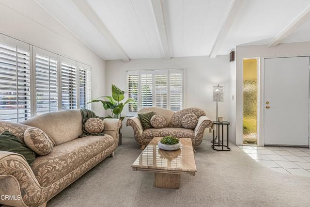 Welcome to this beautifully maintained 2-bedroom, 2-bath home nestled in a serene 55+ community in Camarillo. Offering 1,440 sq ft of comfortable living space on a 4,438 sq ft lot, this delightful residence blends warmth, functionality, and charm throughout. Enjoy tranquil evenings on the inviting front porch, the perfect spot to unwind and take in the quiet surroundings. Inside, you're welcomed by a bright and airy living room, featuring plush carpeting and large windows that bathe the space in natural light. Just off the living room, the dining area flows seamlessly into a well-appointed kitchen with tile flooring, generous cabinetry for all your storage needs, and quality appliances--ideal for everyday cooking or hosting guests. A cozy adjacent family area provides even more room to relax, read, or entertain. The guest bedroom offers convenient access to a full hallway bath, while the spacious primary suite is a true retreat, complete with a private en-suite featuring dual sinks and a luxurious soaking tub. Additional highlights include a covered carport with room for two vehicles and low-maintenance landscaping. With its prime location and comfortable layout, this home is the perfect blend of convenience and easy living in one of Camarillo's most sought-after 55+ communities.