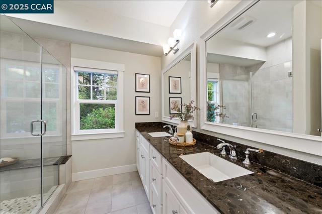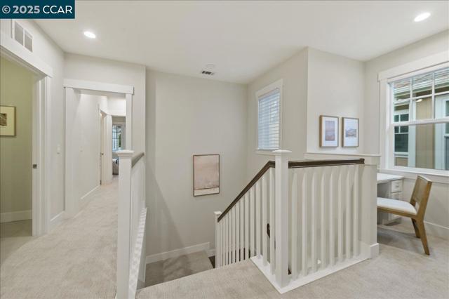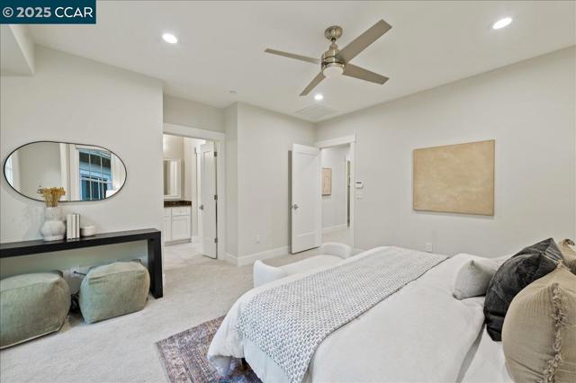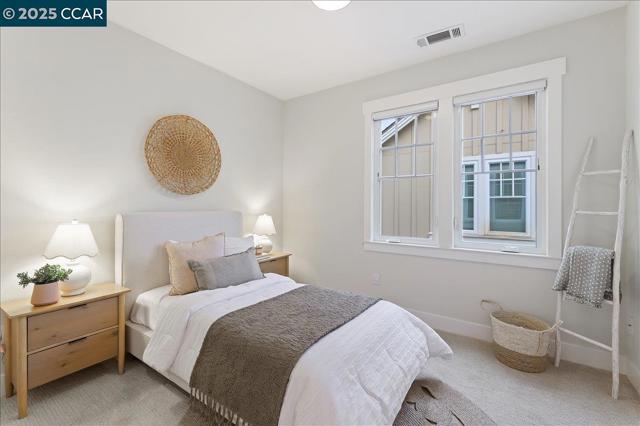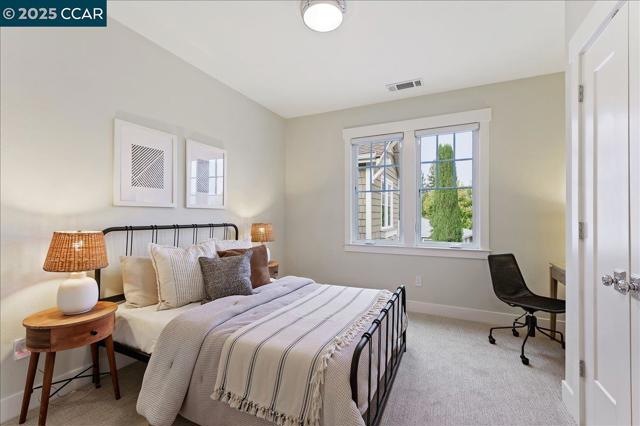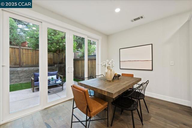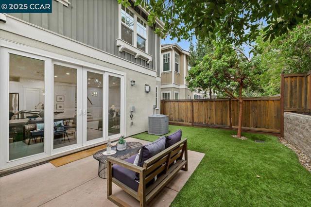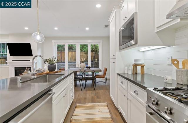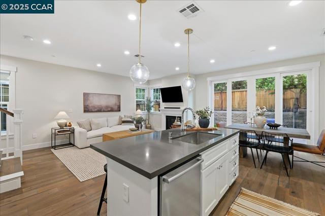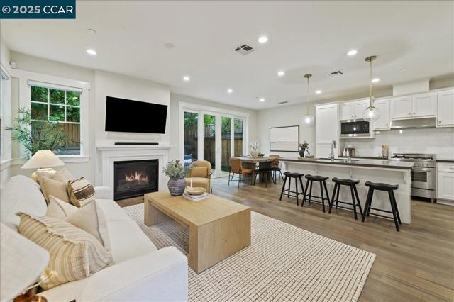 Charming Farmhouse-style townhouse on a quiet, tree-lined lane w/ blooming white rose bushes. Thoughtfully designed interior w/ soaring ceilings, rich hardwood floors, designer lighting & elegant window treatments. Open-concept floor plan w/ style & function formal dining area, expansive glass sliding doors & abundant natural light. The living room offers picturesque windows & cozy fireplace, the gourmet kitchen is masterfully appointed w/ white cabinetry, Quartz countertops, KitchenAid refrigerator, ss appliances, gas range, & oversized island w/ large pantry closet. Upstairs, a mini loft w/ a built-in desk is perfect for a home office. Luxurious primary suite offers privacy from every window, soaring ceilings, & a spa-inspired bath w/ walk-in shower, dual vanities & designer tile details. 2 additional spacious bedrooms share a split bath.Additional highlights include: oversized laundry room w/ cabinetry, attached two-car garage, tankless water heater, ample storage. Outside, the HOA maintains the front landscaping, while the private backyard features a lush turf lawn for low-maintenance enjoyment. With its ideal location just minutes from award-winning schools, parks, downtown Danville, shopping & freeway access, this is Danville living at its best!