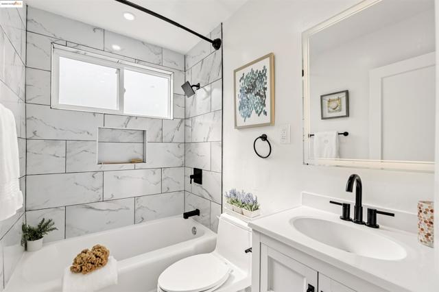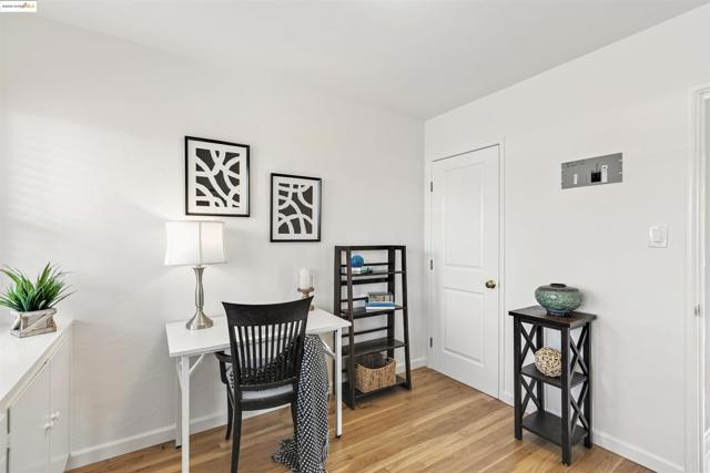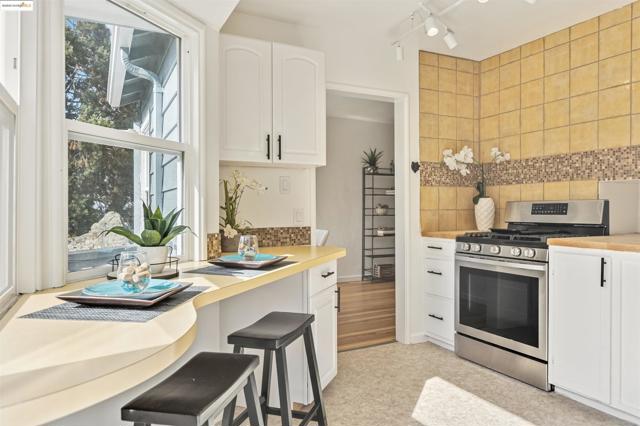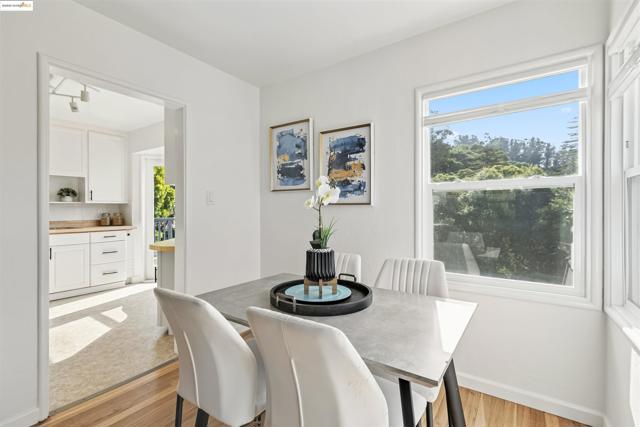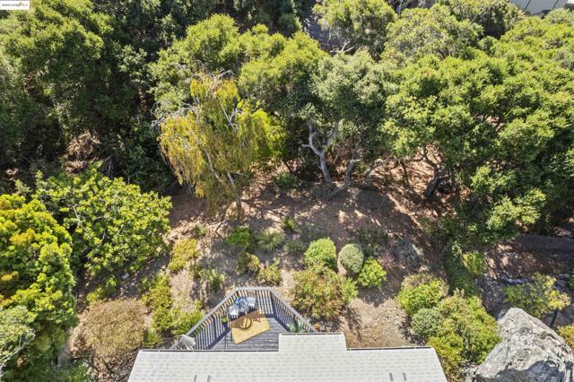 Tucked away in the lush, tree-covered El Cerrito hills & just minutes from the heart of the city, is a serene home that offers the perfect blend of urban convenience with nature-filled living. Surrounded by natural rock formations, mature trees, vibrant greenery, and a stream! The huge lot offers the peak-a-boo Bay and Bridge views & a private retreat that feels worlds away from the hustle & bustle—yet very close the Del Norte BART station, Fred Korematsu Middle School & Castro Park. Just a hop to shops, restaurants, & cultural hotspots. Along with being on a cul-de-sac this special home has no steps to the covered front porch entry. All on one level, there are 3 bedrooms & a lovely updated bath. Full of natural light, & featuring recently refinished gleaming Oak Hardwood floors, the spacious floor plan brings in the outdoors, and highlights the stunning hillside and tree views. PLUS, there's a totally unfinished storage area under the house that would be an excellent expansion opportunity! Sip your morning coffee while enjoying views from the breakfast bar or the elevated fresh air deck. Think of working from home with birdsong in the background, then enjoying sunset walks along nearby trails. This home offers a rare lifestyle—where city energy meets natural tranquility.
