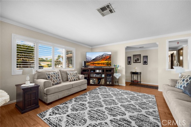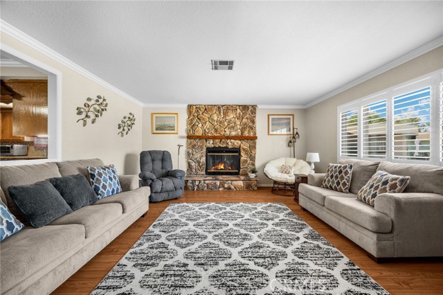 This well-maintained home has so many nice amenities! A Spacious living room with a fireplace, an open floor plan, the kitchen has granite countertops and recessed lighting, laminate flooring in the kitchen, living room, and hallway, retextured walls and ceilings, custom crown molding & baseboards throughout, wood shutters, ceiling fans, separate laundry room inside, large covered patio, RV parking plus a Mobile Home Aluminum Cover, 2 sheds, low-maintenance yards, and located on a cul-de-sac.