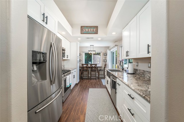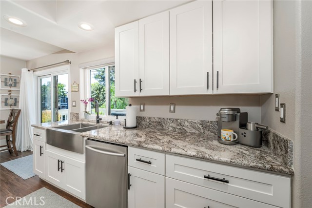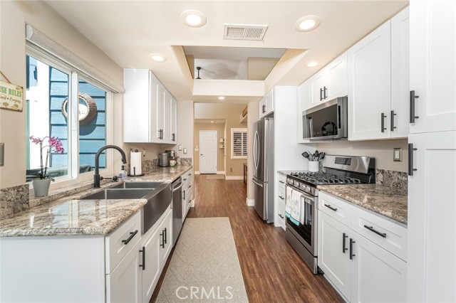 This is the one you have been waiting for with endless views of the lagoon in the back and amazing views of the park in the front! Hands down the best views in all of Seabridge! This beautifully upgraded condo will wow you when you first walk through the door you are greeted with a 12 ft high soaring stack stone fireplace with a custom reclaimed wood wrap around mantle. The open concept large great room features cathedral ceilings and tons of natural light. The updated kitchen boasts of white shaker cabinets with an added pantry, granite countertops, farmhouse sink and stainless-steel appliances. You also have space for a large dining room table that overlooks the lagoon. Step outside onto the deck to enjoy your coffee or cocktails while you sit back and relax to the sound of the waterfalls. Back inside you will find a primary bedroom with beautiful views of the park, vaulted ceiling, and an ensuite bathroom with white shaker cabinets, granite countertops, dual sinks, an extended shower and skylight. The secondary bedroom, which also enjoys view of the park, has a brand-new queen-size murphy bed making it a great flex space that can be used as an office or workout room or whatever you need! There is a spacious second full bathroom with tub. You will also appreciate that this condo has all new windows and sliders, whole house attic fan plus air conditioning so you will be ready for those warm summer nights. There is also an inside laundry with stackable washer and dryer, luxury vinyl flooring throughout, and custom closets. We used company brand names you can trust - Kohler, Delta, Rheem, Ring, WeMo, York, Milgard, COREtec, Hunter, Chamberlain, Samsung, LG, closets by design and Quietcool. All kitchen appliances, stackable washer and dryer and queen murphy bed are included in the sale. You also get a one car detached garage that features custom cabinets along with high loft racks for additional storage. Seabridge Village offers 24-hour guard gates, 4 tennis courts, 4 community pools, 4 jacuzzies, clubhouse, and plenty of green space and walking paths for you and your pets! HOA includes water and trash. Just a short bike ride to the beach! Don’t miss out on this amazing opportunity to live the beach life! Everything has been done for you. You just need to move in!