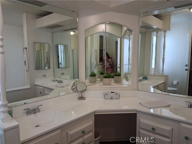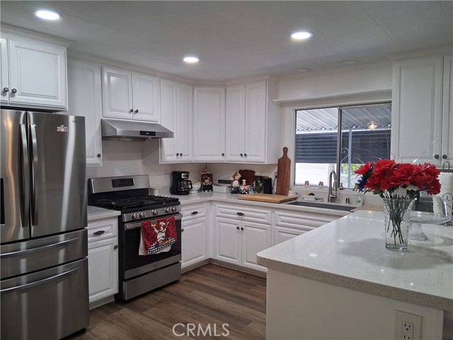 Price adjustment for this very affordable, move-in ready home! You have to see it for yourself. There are many upgrades throughout. This is an immaculate 2 bedroom, 2 bath with an open floor plan. You will be just a short walk away from lush greenbelts and great walking paths which lead to a gorgeous lake! The spacious living room and dining area features a large, lighted, built in China Cabinet. The upgraded kitchen has all newer appliances and quartz counters. The island is large and has loads of storage. The kitchen also has soft glide pull out drawers and recessed lighting. Other upgrades include new laminate flooring throughout and a new air conditioner. The home has newer interior and exterior paint. There is an inside laundry room and huge enclosed patio that can add extra room for family events or everyday use. The storage shed is extra large so you can fit tools, decorations and so much more. This upscale, 55+ community features a serene lifestyle with a heated swimming pool, clubhouse, billiards room, gym, jacuzzi, library, lake for fishing and loads of activities. You also have access to tennis courts and pickle ball at Lake Park Brea. You must have park approval to buy.