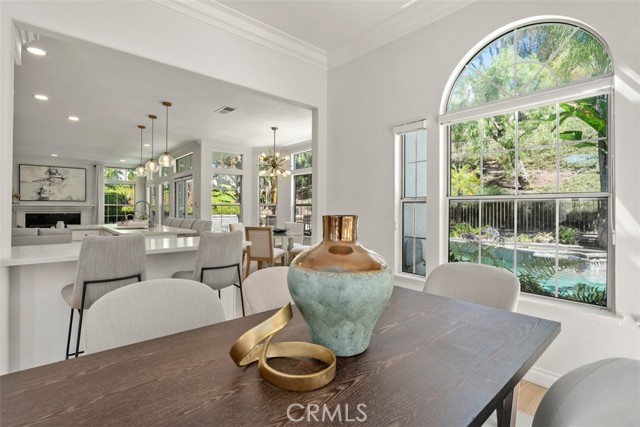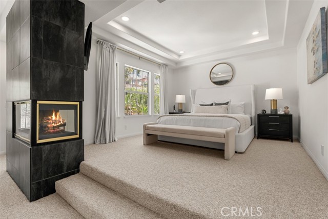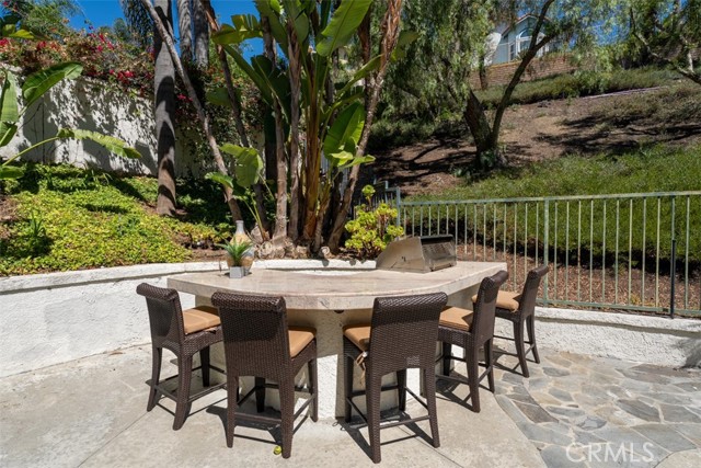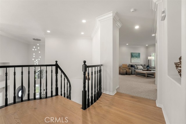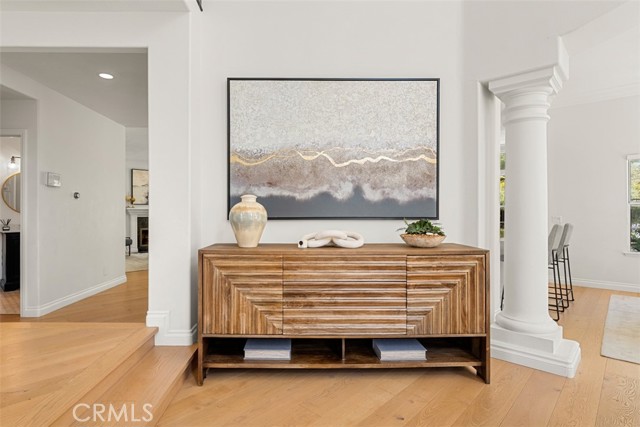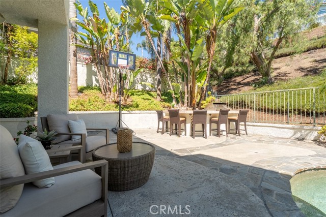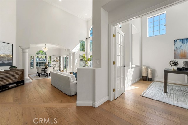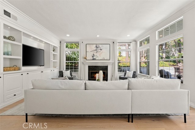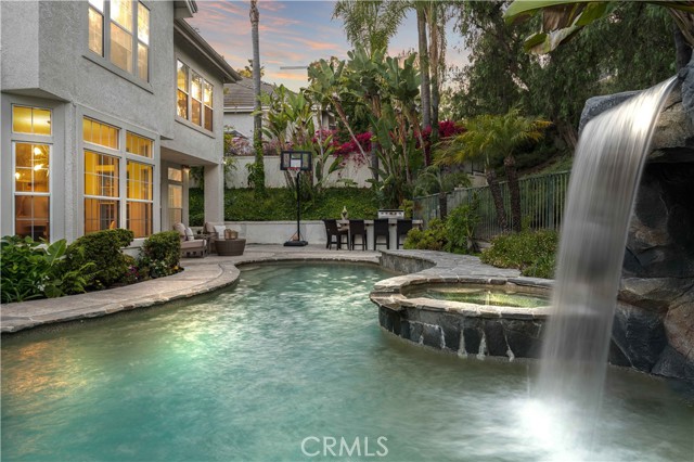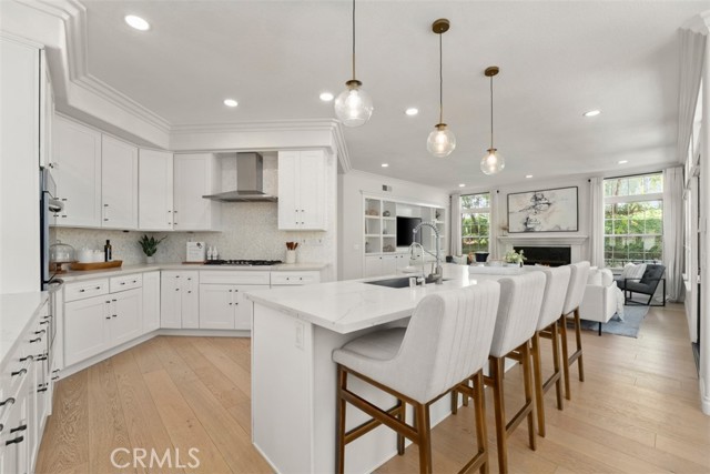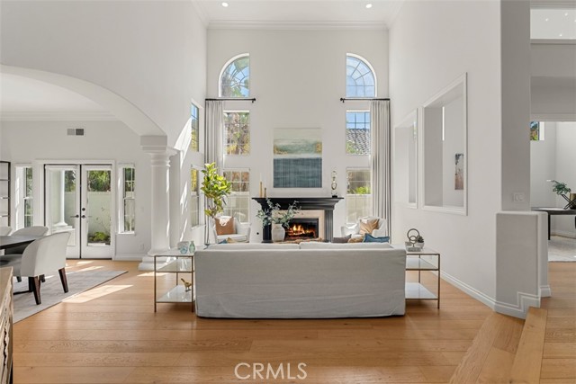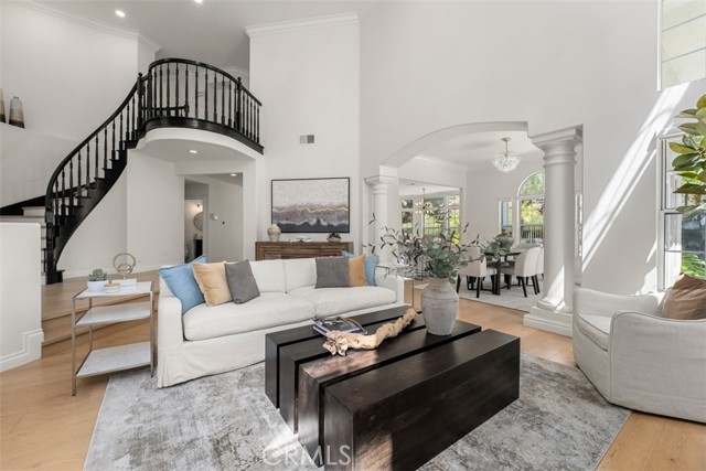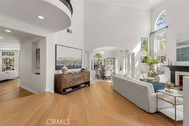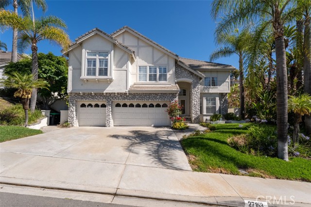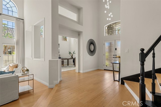 Welcome to 27153 Woodbluff, a stunningly updated 5-bedroom, 4.5-bathroom home nestled in the highly sought-after Moulton Ranch community of Laguna Hills. This spacious and meticulously maintained residence offers over 3,800 square feet of refined living space, blending timeless elegance with thoughtful modern upgrades. As you enter, you're greeted by soaring ceilings, expansive windows, and an open-concept floor plan that invites abundant natural light throughout. The main level features rich hardwood flooring and multiple living and entertaining areas, including a formal dining room, living room with fireplace, and a generous family room that flows seamlessly into the heart of the home—an exquisitely remodeled gourmet kitchen. Designed with both style and functionality in mind, the kitchen showcases custom cabinetry, granite countertops, stainless steel appliances, a reconfigured sink and counter space, and a large center island—perfect for casual dining and entertaining. The adjacent family room offers a warm and inviting atmosphere with a beautifully appointed fireplace and easy access to the backyard. A main-level bedroom with a private en-suite bath offers flexible living options for guests, extended family, or a dedicated home office. Upstairs, brand-new plush carpeting adds comfort, while the expansive primary suite serves as a true sanctuary. Enjoy a fully rebuilt spa-like bathroom with designer finishes, dual vanities, soaking tub, a large walk-in shower, and a custom walk-in closet. A second fireplace, also newly redone, adds a touch of luxury to the suite. Additional highlights include a fully renovated powder room, an upstairs laundry room for convenience, and three additional secondary bedrooms—each generously sized and filled with natural light. Step outside to a private backyard surrounded by mature landscaping, offering the perfect setting for outdoor dining, entertaining, or peaceful relaxation. Completing this exceptional home is a spacious 3-car garage, low HOA, and proximity to top-rated schools, parks, hiking trails, and major shopping and dining destinations. With quality upgrades throughout and located in one of Laguna Hills’ most desirable communities, this home is a rare opportunity you won’t want to miss.