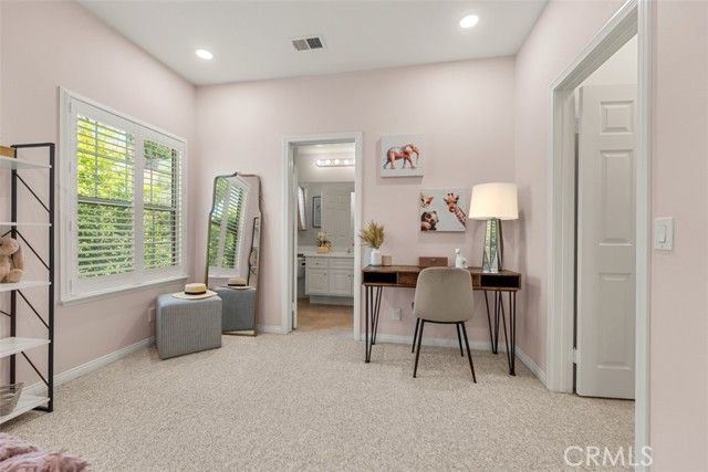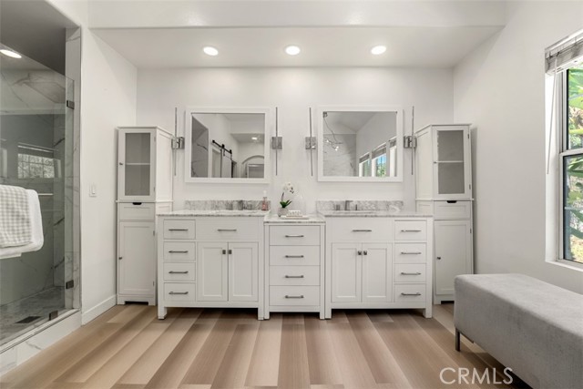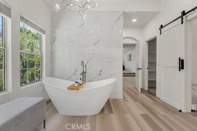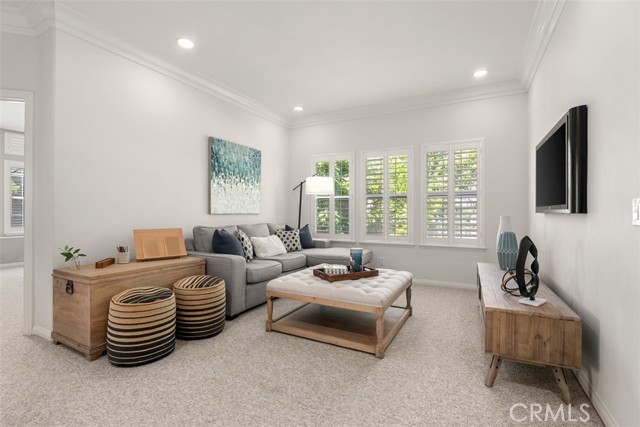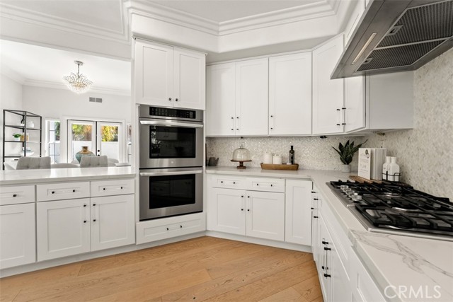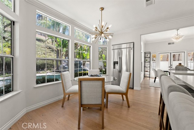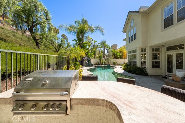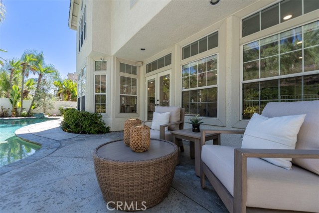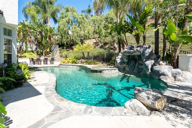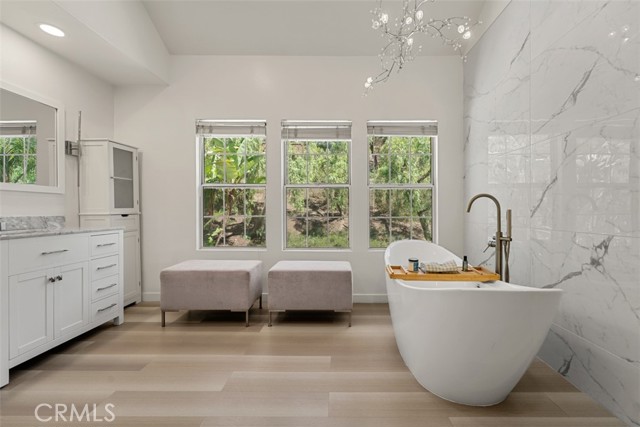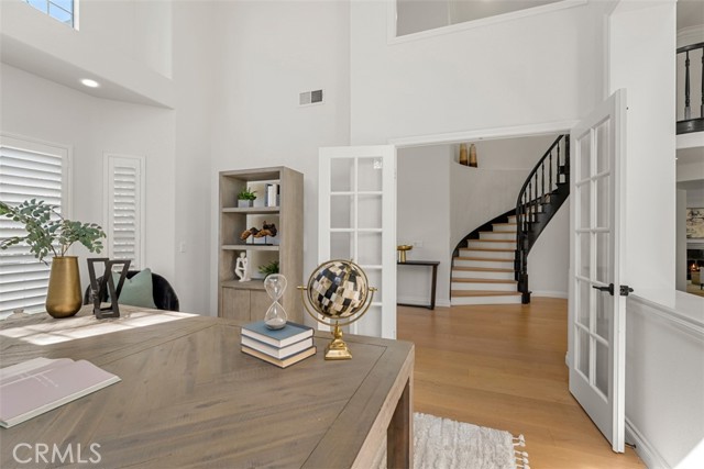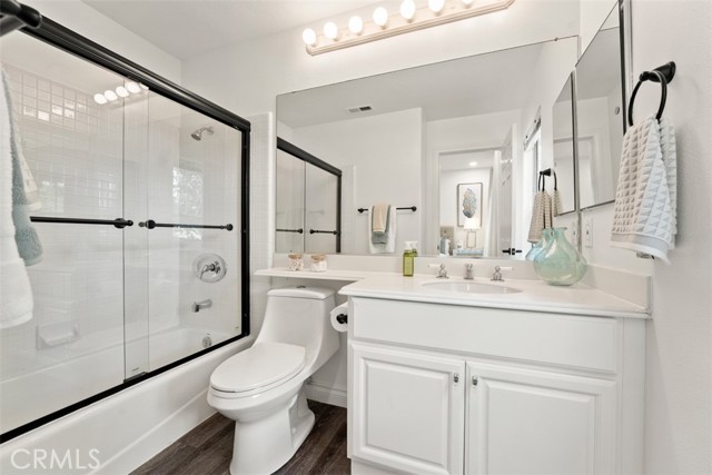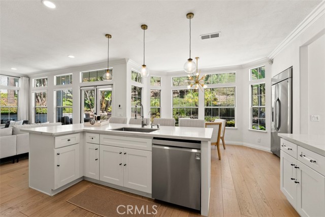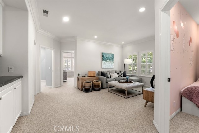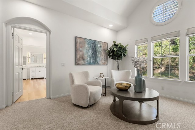 Welcome to 27153 Woodbluff, a stunningly updated 5-bedroom, 4.5-bathroom home nestled in the highly sought-after Moulton Ranch community of Laguna Hills. This spacious and meticulously maintained residence offers over 3,800 square feet of refined living space, blending timeless elegance with thoughtful modern upgrades. As you enter, you're greeted by soaring ceilings, expansive windows, and an open-concept floor plan that invites abundant natural light throughout. The main level features rich hardwood flooring and multiple living and entertaining areas, including a formal dining room, living room with fireplace, and a generous family room that flows seamlessly into the heart of the home—an exquisitely remodeled gourmet kitchen. Designed with both style and functionality in mind, the kitchen showcases custom cabinetry, granite countertops, stainless steel appliances, a reconfigured sink and counter space, and a large center island—perfect for casual dining and entertaining. The adjacent family room offers a warm and inviting atmosphere with a beautifully appointed fireplace and easy access to the backyard. A main-level bedroom with a private en-suite bath offers flexible living options for guests, extended family, or a dedicated home office. Upstairs, brand-new plush carpeting adds comfort, while the expansive primary suite serves as a true sanctuary. Enjoy a fully rebuilt spa-like bathroom with designer finishes, dual vanities, soaking tub, a large walk-in shower, and a custom walk-in closet. A second fireplace, also newly redone, adds a touch of luxury to the suite. Additional highlights include a fully renovated powder room, an upstairs laundry room for convenience, and three additional secondary bedrooms—each generously sized and filled with natural light. Step outside to a private backyard surrounded by mature landscaping, offering the perfect setting for outdoor dining, entertaining, or peaceful relaxation. Completing this exceptional home is a spacious 3-car garage, low HOA, and proximity to top-rated schools, parks, hiking trails, and major shopping and dining destinations. With quality upgrades throughout and located in one of Laguna Hills’ most desirable communities, this home is a rare opportunity you won’t want to miss.