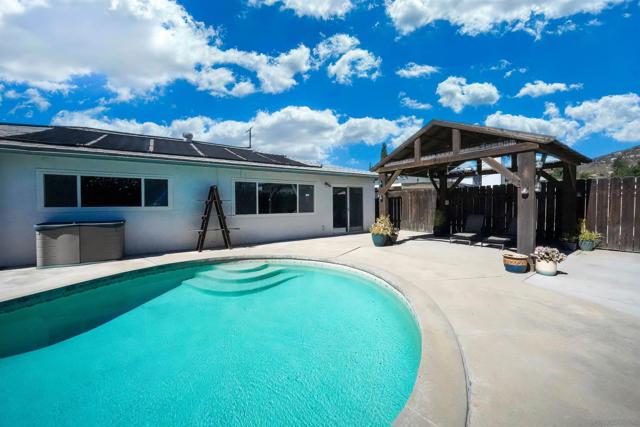 Fantastic Location with Incredible Features! Perfectly situated just minutes from downtown Lakeside, the rodeo grounds, Lindo Lake, and more! This well maintained property offers a blend of comfort, style, and convenience. Owned Solar – Say goodbye to high electric bills! Spacious Master Suite – Features a huge walk-in closet, private bathroom with plenty of natural light. Modern Comforts – Newer A/C unit. High ceilings for a bright, open feel. Open-Concept Living Room, hugely spacious and ideal for gatherings. Finished Garage – New concrete flooring, stunning wood ceiling, and epoxy finish—perfect as a family room or bonus space. Enclosed Front Patio – A perfect space to unwind. Sparkling Saltwater Pool – Recently replastered, complete with a slide and separate solar heating. Charming Gazebo, equipped with lighting for relaxing evenings or entertaining guests. Private Road Access – Peaceful and secluded. Don't miss your chance to own this gem in the heart of Lakeside!