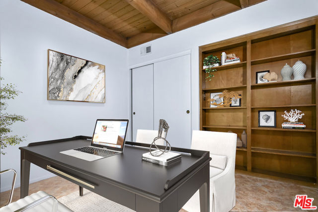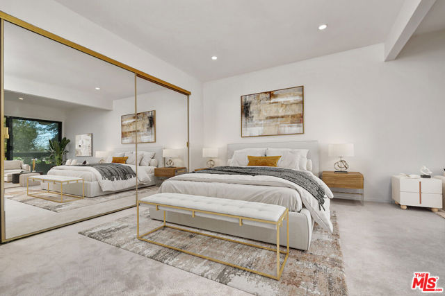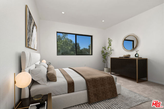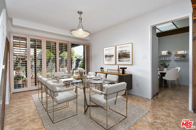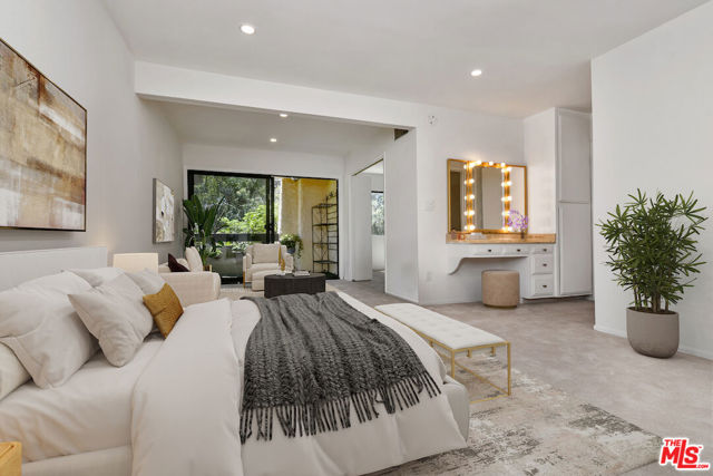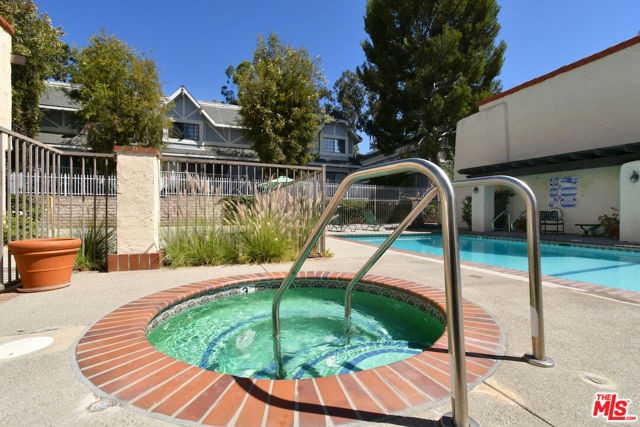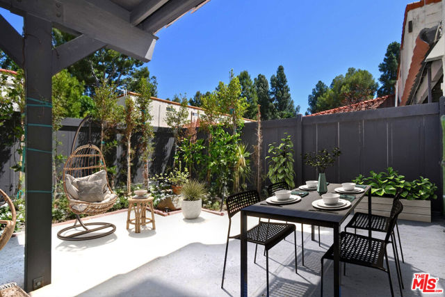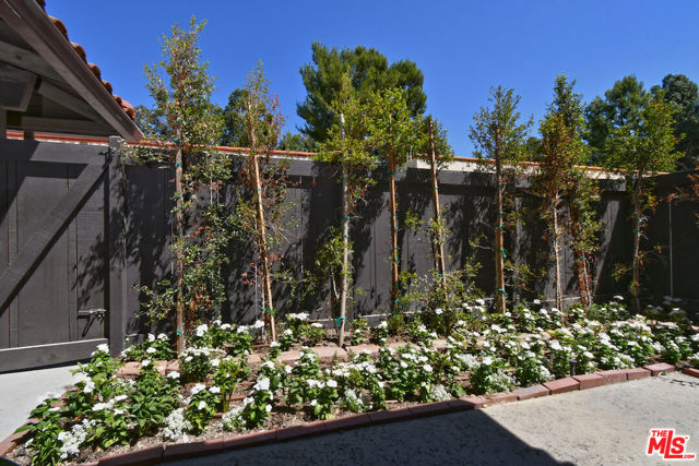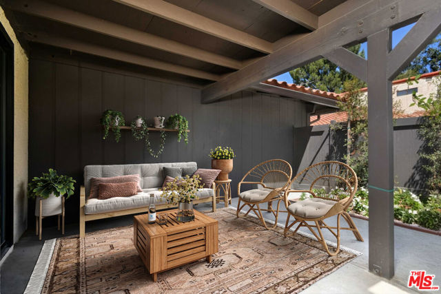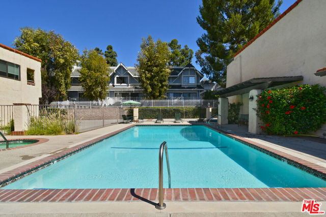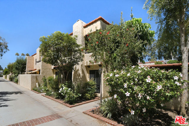 This spacious townhouse features 4 bedrooms, 4th bedroom could also be a den. The living room is highlighted by an adobe fireplace, floor to ceiling windows with custom shutters providing views of the surrounding greenery and the adjoining park. The dining area situated next to a built in bar, opens via sliding glass doors onto an extra large garden patio with BBQ and refrigerator. The kitchen is thoughtfully designed for convenience, featuring a breakfast area and window that connects directly to the patio...ideal for effortless entertaining. The freshly carpeted upstairs has a primary suite with comfortable sitting room, dedicated makeup table and private balcony with serene treetop views plus two additional bedroom and bath. Additional amenities include a laundry room with generous storage options and a two-car garage enhanced with built-in shelving and a spacious loft offering ample room for extra storage. This family oriented community has a pool and spa with his and hers showers and dressing rooms and ample parking for guests. All of this within minutes to acclaimed restaurants, premier shopping, beautiful parks and top rated schools. HOA includes water and earthquake insurance.