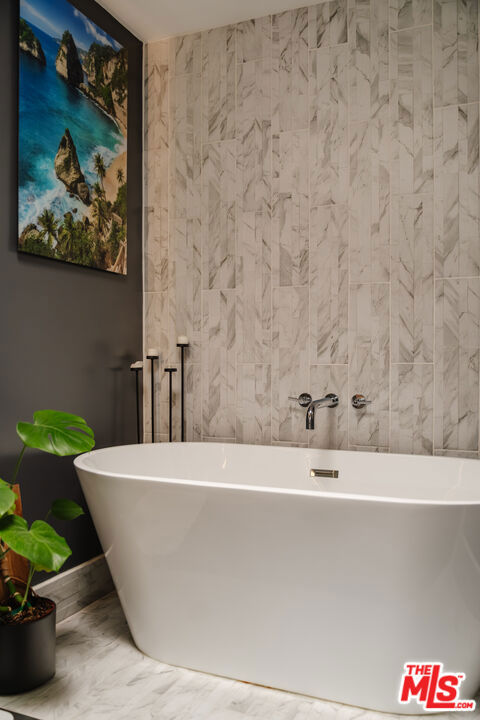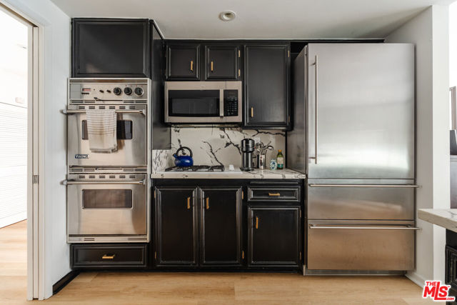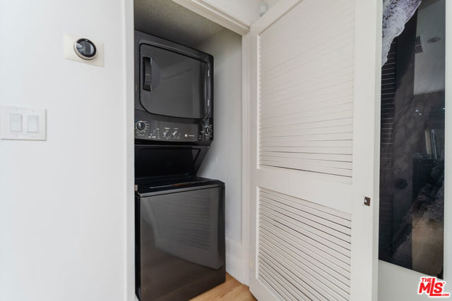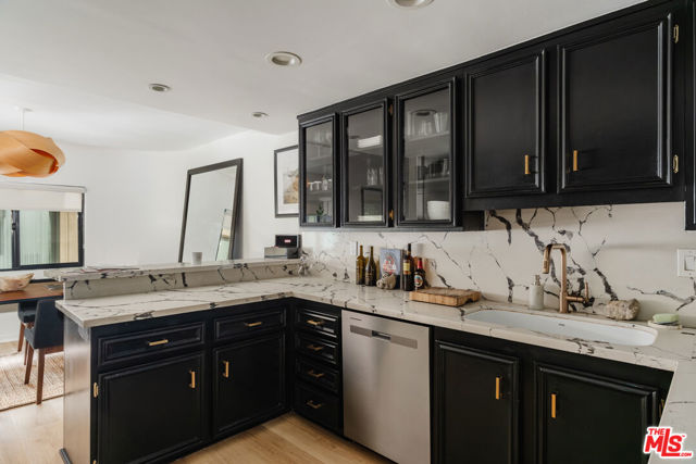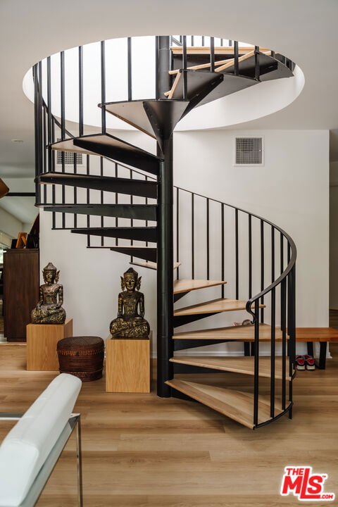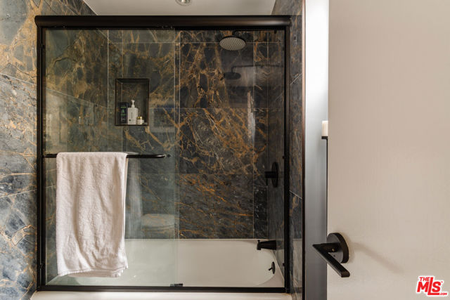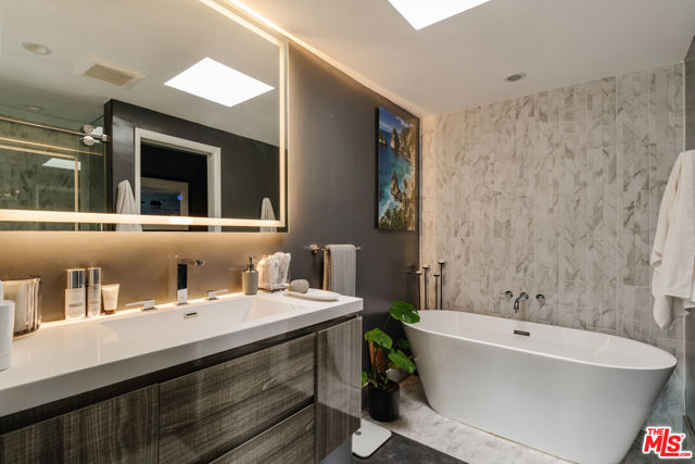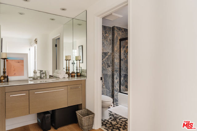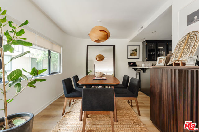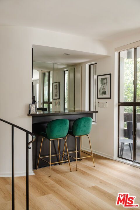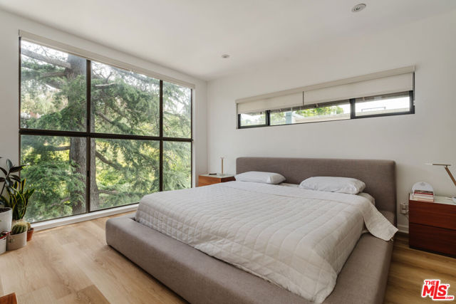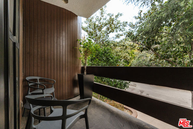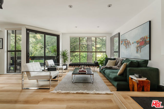 Tucked within one of the few condominium enclaves in the prestigious Bel Air neighborhood, this rare two-level townhome blends architectural style, modern comfort, and serene indoor-outdoor living. One of just seven residences and only sharing one wall with neighbors, the home offers a refined retreat amid a setting typically reserved for grand estates. Upon entry, a light-filled living space welcomes with floor-to-ceiling windows, a sleek gas fireplace, and seamless access to a covered balcony framed by leafy treetops--an idyllic perch for morning coffee or evening repose. The adjacent kitchen makes a striking statement with matte black cabinetry, brushed brass hardware, and quartz countertops, punctuated by Viking double ovens and a dedicated wine fridge. A stylish dining area and a built-in wet bar enhance the lower level, ideal for everything from quiet mornings to lively entertaining. Upstairs, a skylight above the spiral staircase allows radiant natural light to fill the space. A private wood-clad courtyard offers a rare al fresco moment--an intimate outdoor escape just outside the bedroom suites. Both bedrooms are generously scaled and feature en suite baths, providing comfort and privacy. The primary suite is graced with oversized windows and ample storage, while its recently updated bathroom includes a tiled soaking tub beneath a skylight and glass-enclosed shower, creating a spa-like sanctuary. Glass block detailing adds a retro-chic flourish to the upper hall, and a stacked laundry closet offers everyday convenience without compromising design. Ideally located for those who seek privacy without isolation, this Bel Air gem is just minutes from The Getty Center, Brentwood Village, Westwood, and the 405 freeway--pairing tranquil living with effortless access to the best of the Westside.