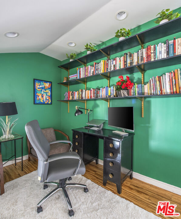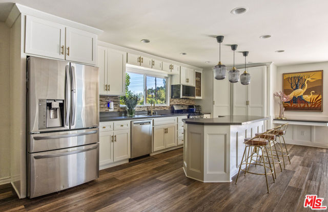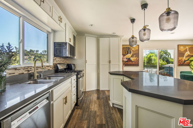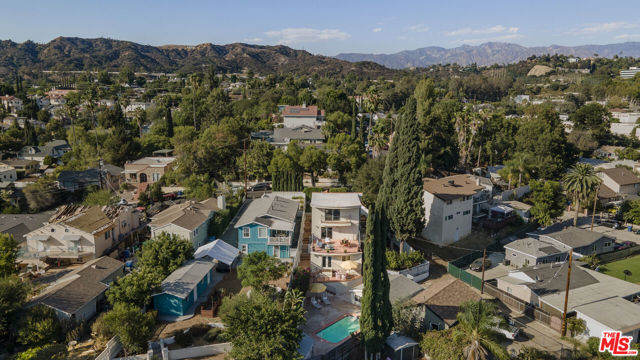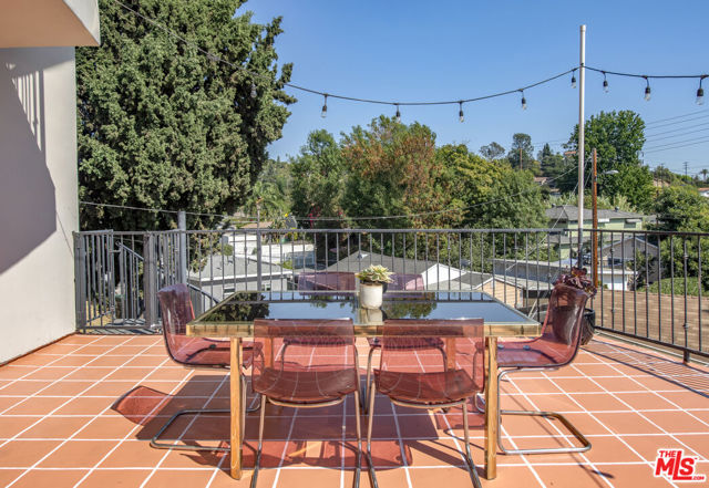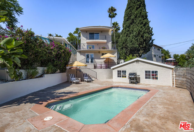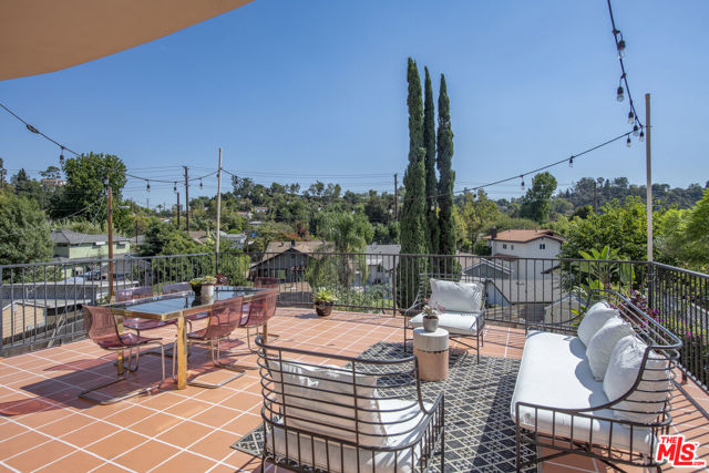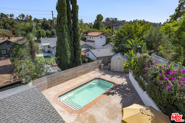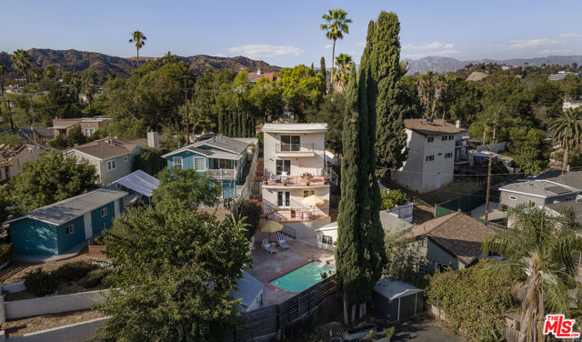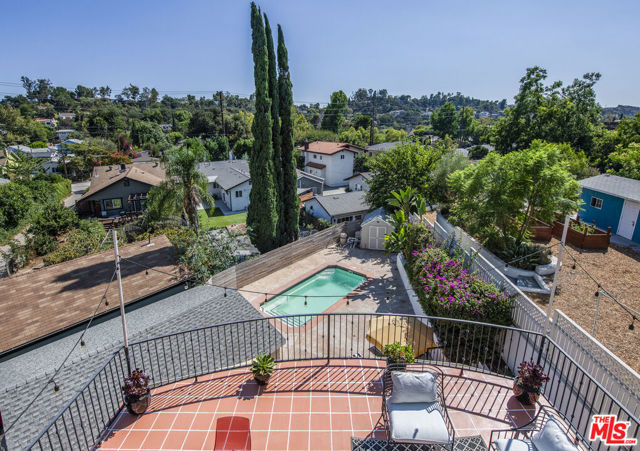 Perched high in the coveted hills of Eagle Rock, this sophisticated tri-level residence delivers privacy, drama, and sweeping skyline views. A drought-tolerant front garden leads to a shaded double-door entry, opening to soaring ceilings and a sun-drenched living room with built-ins and powder room. The newly reimagined kitchen dazzles with quartz counters, a generous island, and top-tier stainless appliances, flowing seamlessly to the dining area and expansive balcony for al fresco evenings with the city lights as your backdrop.Upstairs, the primary suite is a true retreat with its own balcony, walk-in closet, and spa-style bath featuring dual sinks, soaking tub, and glass-enclosed shower. A versatile bonus room nearby is ideal as a nursery or office. The lower level offers two additional bedrooms, a sleekly remodeled bath, and a spacious bonus room ready for a home gym, media lounge, or creative studio.Out back, an entertainer's playground awaits a sparkling pool with cabana, shaded terrace, and a lush collection of fruit trees. Multiple balconies capture the magic of indoor-outdoor California living. Just moments to Eagle Rock's prized schools, Trader Joe's, trendy cafes, and parks, this turnkey home embodies style, serenity, and location all in one.