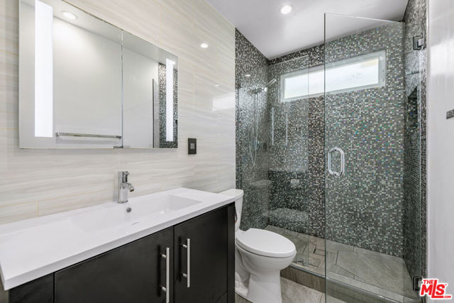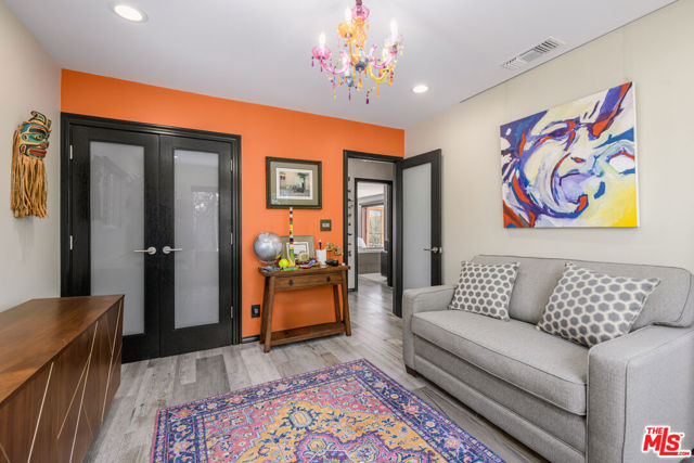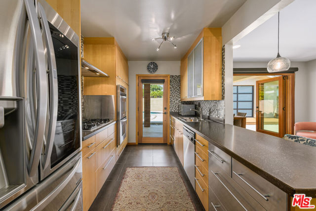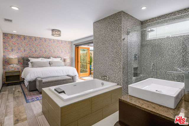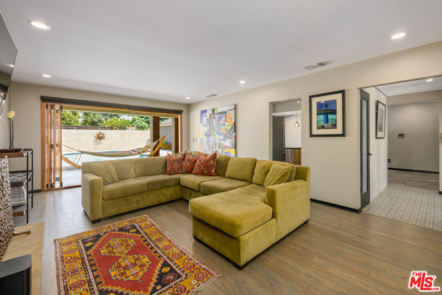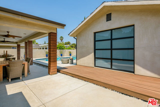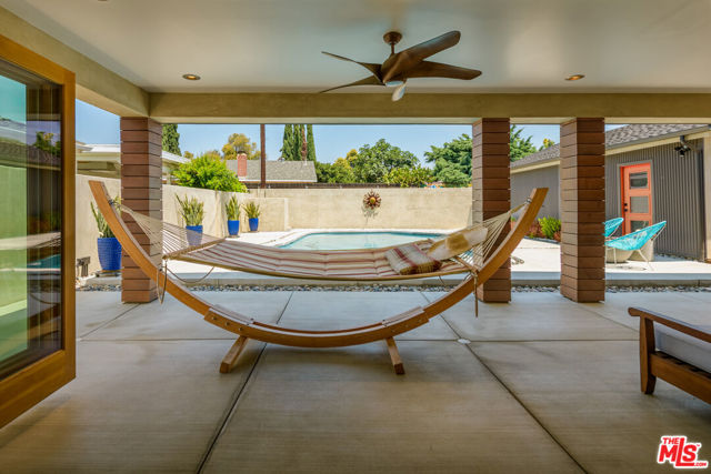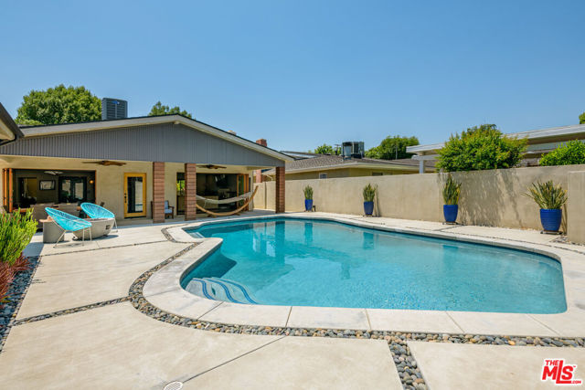 Beautifully renovated with designer details, this 3 bed / 2 bath home blends high-end finishes and thoughtful upgrades in a charming Valley locale. Featuring custom concrete walkways, serene water fountain, lush drought-tolerant landscaping and garden, Mexican river rock accents, and curated decking. The exterior includes smooth Santa Barbara stucco, an outdoor pool shower, custom accordion doors and pergola, iron gates, and Brazilian Ipe wood privacy fencing. Inside, enjoy real oak floors, South American porcelain tile, abundant natural light evoking an indoor-outdoor flow, and custom automatic blinds. The epicurean kitchen offers island seating, modern appliances, and open access to the formal dining room, with seamless transitions to al fresco dining by the pool. The primary suite boasts a spa-like bath with a Roman Jacuzzi tub, custom vanity, private outdoor seating, and stunning Missoni garden wallpaper. The backyard features a remodeled pool with Pentair system and an adjacent outdoor fire pit for relaxed evenings. The detached 2+ car garage, with epoxy floors and dual doors, offers ideal flex space for a gym, office, or creative studio. A true gem with exceptional private outdoor living, this home is a perfect combination of original architectural integrity and resort-style design. Close to The Vineyards at Porter Ranch, Fashion Center shopping, dining, entertainment, fitness, and local award-winning schools! Welcome home.