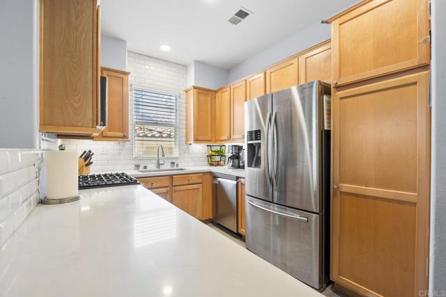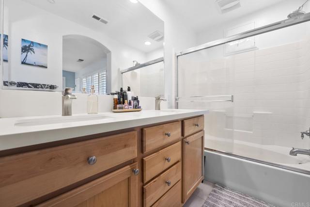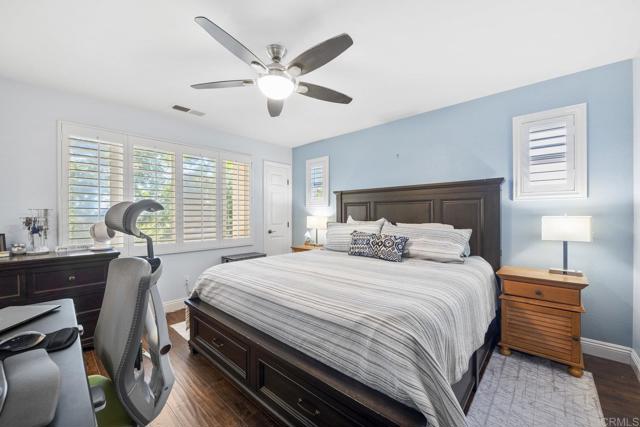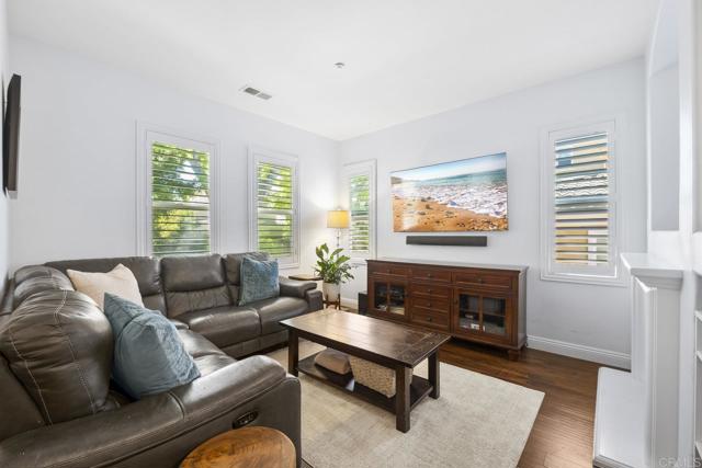 San Elijo Townhome in the Best Location! This open concept home flooded with natural light and ocean breezes is a must see in the highly sought after gated neighborhood of Westridge Village. Prime location in the heart of San Elijo Hills right near parks, town center, and top rated schools! Entertain friends or retreat to the sparkling resort style pool oasis with hot tub. This unit is extremely quiet but just a moments stroll to the pool or town center, achieving the perfect lifestyle balance. As you walk into the flowing floor plan, you are greeted with Italian glazed porcelain flooring featured in the entry, bath, and kitchen, along with gorgeous wood floors, and plantation shutters throughout. Sunlight filters into the home through the spacious patio showcasing a large storybook tree. The grounds are surrounded with beautiful birds of paradise and lush landscaping. The chef's kitchen features stunning Carrera quartz countertops and stainless appliances. A window over the large undermount sink lets in natural light and features a designer beveled subway backsplash. The remodeled guest spa boasts a quartz vanity and frameless walk-in shower that highlights 2 rainfall shower heads, designer porcelain plank tile, and a beach stone shower floor for ultimate luxury and relaxation. This bathroom even has custom installed Bluetooth surround sound! Upstairs in the master suite you will find views of the ocean, hills, and tons of natural light filtered through the greenery of the outside trees. The master features a walk-in closet, ceiling fan, and dual quartz vanity with Kohler brushed nickel faucets. Stroll by the San Elijo fountain to grab a cup of coffee, pick up groceries, or visit the local brewery. Open your front door and you are only steps away to dining at local restaurants or taking art and exercise classes. The community park right outside Westridge hosts summer movies in the park, weekend sports, holiday events, and more. Additional highlights include in-unit laundry, new fixtures, one-click gas fireplace, recessed lighting, central A/C, built-in closet shelving, smart home technology, rooms wired for Ethernet, overhead garage storage and flooring, and recently installed kitchen appliances. One of the closest homes in all of San Elijo Hills to the Elementary school makes this home a great long term investment! You will love this Westridge home in a perfect location! Minutes to Cal State San Marcos and just 8 miles to the beach! Conveniently close to the incredible amenities of living in the San Elijo Hills community: lighted ballparks, soccer fields, picnic tables, BBQ's, playgrounds, dog park, splash ground, community center, all within walking distance! Enjoy the new restaurants and shops along with 18 miles of trails, 19 acres of parks, & 1000 acres of open space. Zoned for award winning San Elijo Elementary, San Elijo Middle and San Marcos High School.