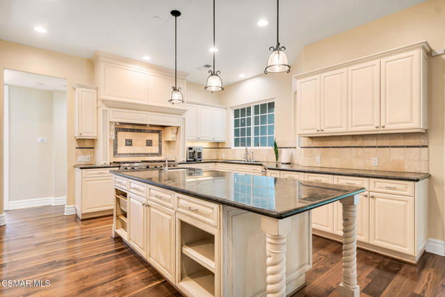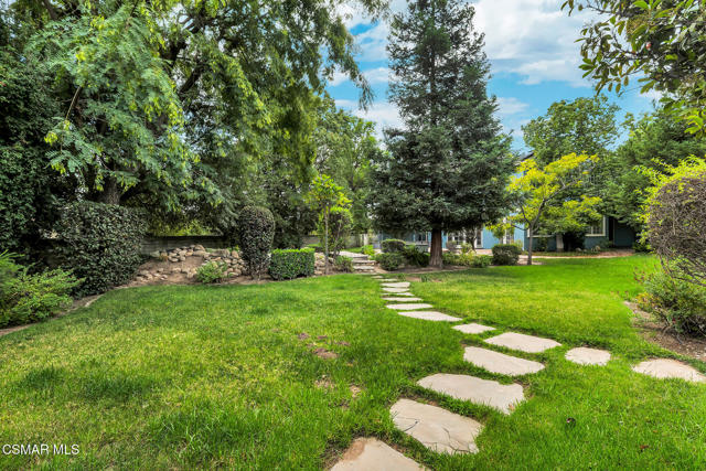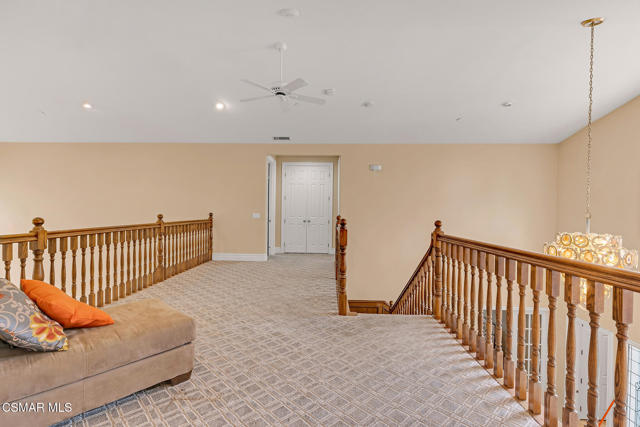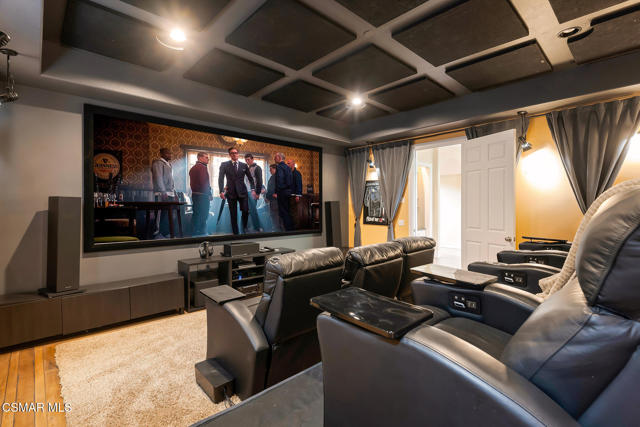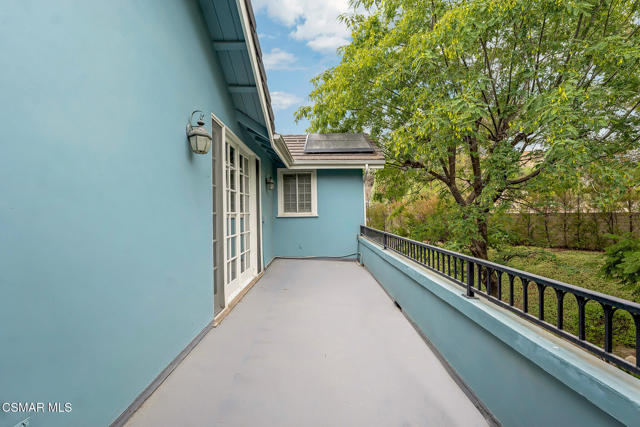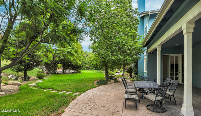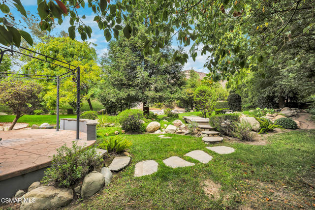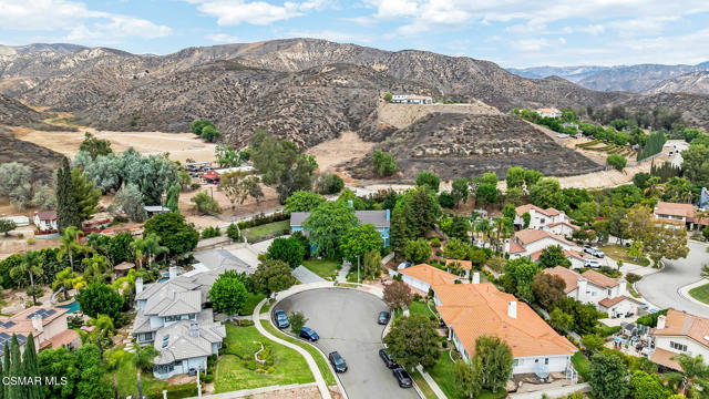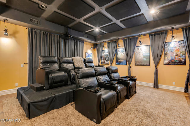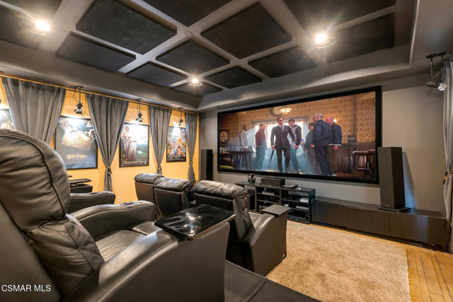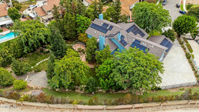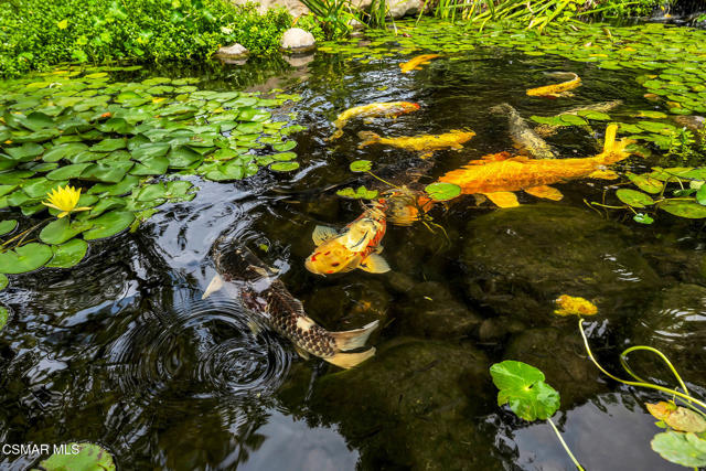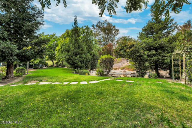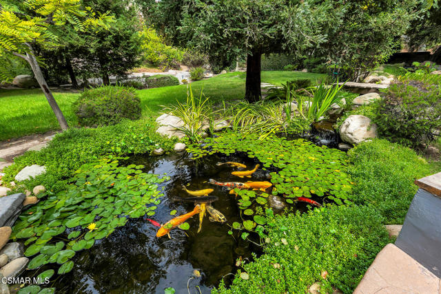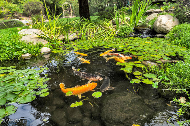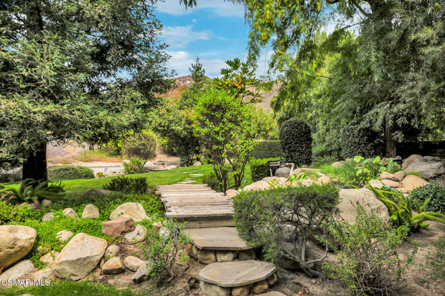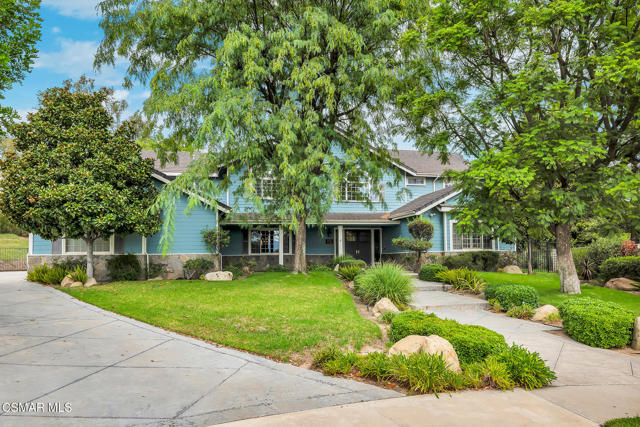 A rare offering in Simi Valley, this custom 6-bedroom, 6.5-bath estate crowns the end of a quiet cul-de-sac, presenting over 5,600 sq. ft. of refined living on a 25,000+ sq. ft. lot. Currently owned by a Hollywood producer who sought a private retreat outside the city, the estate has also hosted gatherings attended by movie stars, directors, and producers -- a testament to its scale and entertaining appeal. The approach is framed by mature shade trees, lush landscaping, river rock accents, and a custom river rock mailbox. An extra-long and wide stamped concrete driveway with possible RV parking enhances curb appeal, while the custom double-door entry with leaded glass sidelights sets a welcoming tone. Inside, the foyer opens with real wood floors, soaring ceilings, and an artisan agate chandelier. To the left, a study/office with floor-to-ceiling custom built-ins provides the perfect setting for a home library or workspace, while still offering the versatility of a bedroom with ensuite bath. Nearby, French glass doors open to an additional room, previously used as a music room, ideal as a den, playroom, or creative space. The formal living room rises to 30 feet with abundant windows and a travertine raised-hearth fireplace, while French doors lead to the backyard. Off the living room, a dedicated theater room boasts a 210' screen, Sony projector, blackout curtains, surround sound, and 7 reclining chairs -- all included. The gourmet kitchen showcases two full-capacity Sub-Zero units--refrigerator and freezer, a Viking 6-burner cooktop with griddle and hood flanked by custom spice racks, a Viking microwave, Bosch dishwasher, abundant cabinetry with built-in storage nooks, and an extra-long granite island with travertine accents and pendant lighting. A butler's pantry with sink, wine refrigeration, and walk-in pantry enhances functionality, while a built-in china cabinet and casual dining area add charm. A second bedroom with adjacent bath, laundry room, and guest powder room complete the lower level. Upstairs, an open loft-style landing creates a striking catwalk across the home, overlooking the living areas below and connecting the bedrooms. The primary suite offers a private retreat with a balcony overlooking the backyard, sitting area, fireplace, dual walk-in closets with organizers, and a marble bath with dual vanities, soaking tub, and steam shower with dual heads. Three additional ensuite bedrooms with closet organizers complete the upper floor. The backyard feels like a private park, with expansive lawns, stamped concrete patios, covered sitting areas, koi pond with waterfall and wood bridge, rose gardens, grapevines, and fruit trees -- plus plenty of space to add a pool, greenhouse, or other features to fit your lifestyle. The spacious 3-car garage includes epoxy flooring, overhead storage, an updated electrical panel, two 220v outlets for EV charging, and a full-size safe. Energy efficiency is enhanced by a solar system paired with four Tesla wall batteries, designed to provide significant backup capability, including support for the home's zoned A/C system. Additional features include three fireplaces, dual-paned windows with shutters, Nest temperature controls in every room, a recirculating water heater, a replaced sewer line, and fiber-optic connectivity for reliable high-speed internet access. Additional highlights include no HOA, a quiet neighborhood setting, and proximity to Lemon Park. Finishing touches include all artisan chandeliers and sconces handcrafted by Corbett. Blending custom design, thoughtful upgrades, and resort-style grounds, this estate is truly one of Simi Valley's premier residences.