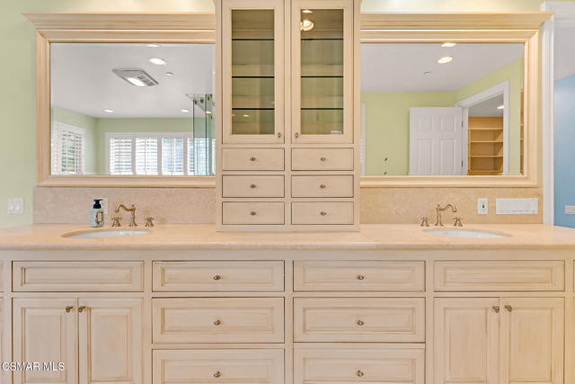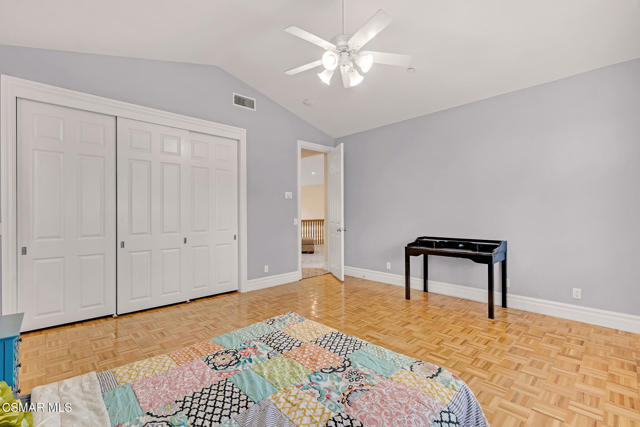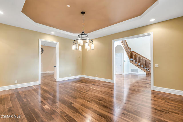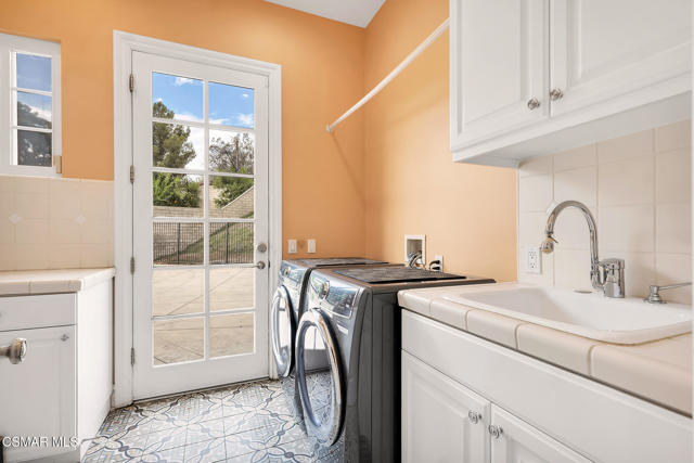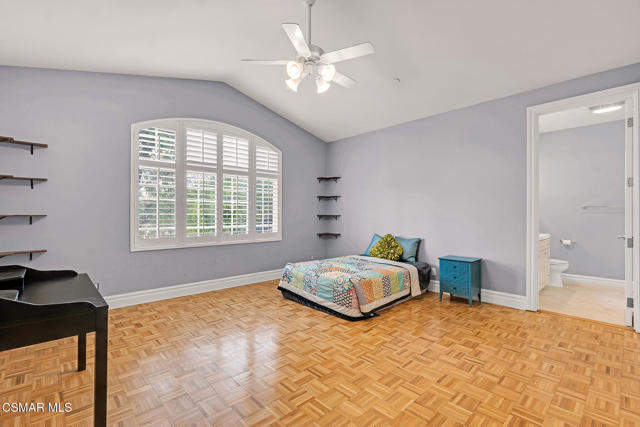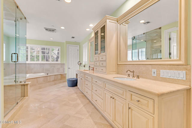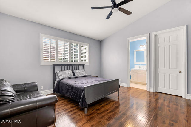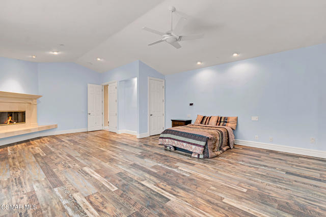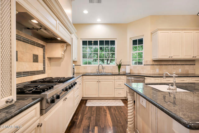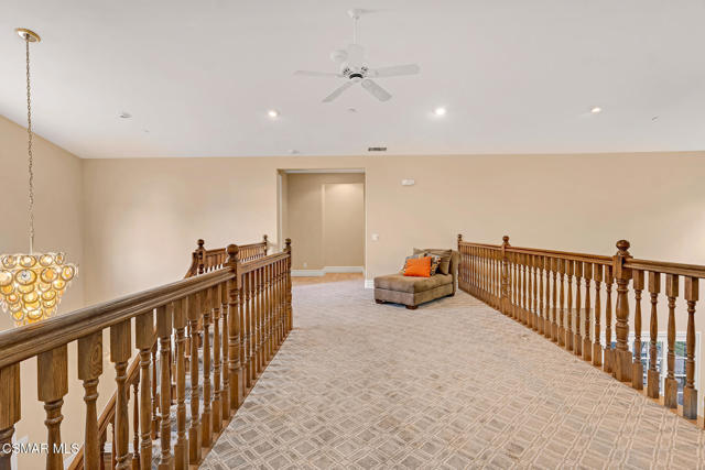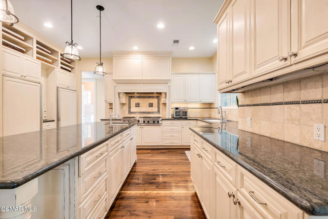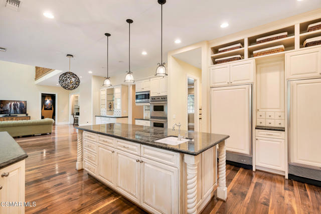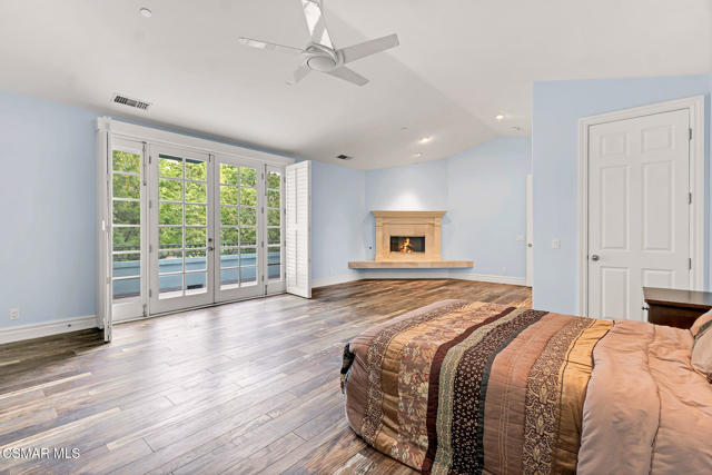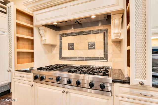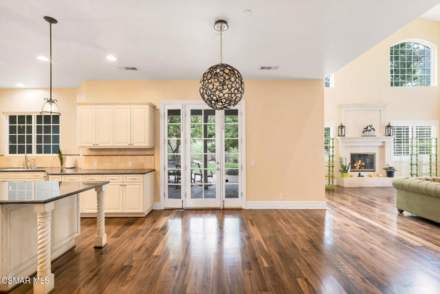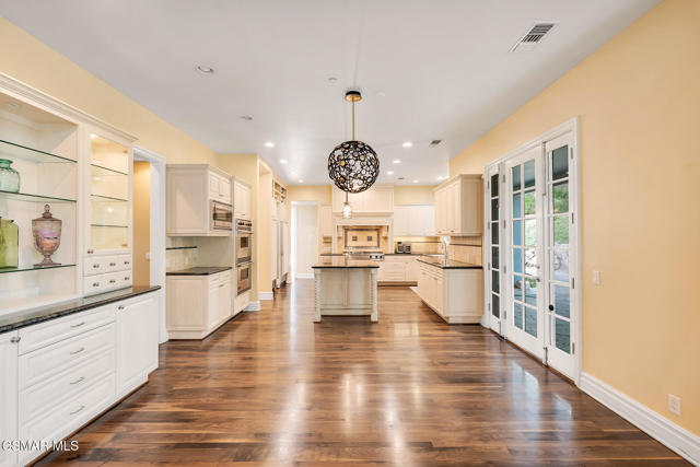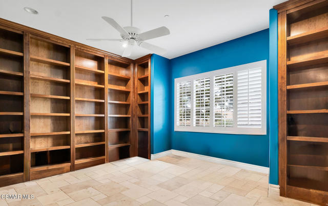 A rare offering in Simi Valley, this custom 6-bedroom, 6.5-bath estate crowns the end of a quiet cul-de-sac, presenting over 5,600 sq. ft. of refined living on a 25,000+ sq. ft. lot. Currently owned by a Hollywood producer who sought a private retreat outside the city, the estate has also hosted gatherings attended by movie stars, directors, and producers -- a testament to its scale and entertaining appeal. The approach is framed by mature shade trees, lush landscaping, river rock accents, and a custom river rock mailbox. An extra-long and wide stamped concrete driveway with possible RV parking enhances curb appeal, while the custom double-door entry with leaded glass sidelights sets a welcoming tone. Inside, the foyer opens with real wood floors, soaring ceilings, and an artisan agate chandelier. To the left, a study/office with floor-to-ceiling custom built-ins provides the perfect setting for a home library or workspace, while still offering the versatility of a bedroom with ensuite bath. Nearby, French glass doors open to an additional room, previously used as a music room, ideal as a den, playroom, or creative space. The formal living room rises to 30 feet with abundant windows and a travertine raised-hearth fireplace, while French doors lead to the backyard. Off the living room, a dedicated theater room boasts a 210' screen, Sony projector, blackout curtains, surround sound, and 7 reclining chairs -- all included. The gourmet kitchen showcases two full-capacity Sub-Zero units--refrigerator and freezer, a Viking 6-burner cooktop with griddle and hood flanked by custom spice racks, a Viking microwave, Bosch dishwasher, abundant cabinetry with built-in storage nooks, and an extra-long granite island with travertine accents and pendant lighting. A butler's pantry with sink, wine refrigeration, and walk-in pantry enhances functionality, while a built-in china cabinet and casual dining area add charm. A second bedroom with adjacent bath, laundry room, and guest powder room complete the lower level. Upstairs, an open loft-style landing creates a striking catwalk across the home, overlooking the living areas below and connecting the bedrooms. The primary suite offers a private retreat with a balcony overlooking the backyard, sitting area, fireplace, dual walk-in closets with organizers, and a marble bath with dual vanities, soaking tub, and steam shower with dual heads. Three additional ensuite bedrooms with closet organizers complete the upper floor. The backyard feels like a private park, with expansive lawns, stamped concrete patios, covered sitting areas, koi pond with waterfall and wood bridge, rose gardens, grapevines, and fruit trees -- plus plenty of space to add a pool, greenhouse, or other features to fit your lifestyle. The spacious 3-car garage includes epoxy flooring, overhead storage, an updated electrical panel, two 220v outlets for EV charging, and a full-size safe. Energy efficiency is enhanced by a solar system paired with four Tesla wall batteries, designed to provide significant backup capability, including support for the home's zoned A/C system. Additional features include three fireplaces, dual-paned windows with shutters, Nest temperature controls in every room, a recirculating water heater, a replaced sewer line, and fiber-optic connectivity for reliable high-speed internet access. Additional highlights include no HOA, a quiet neighborhood setting, and proximity to Lemon Park. Finishing touches include all artisan chandeliers and sconces handcrafted by Corbett. Blending custom design, thoughtful upgrades, and resort-style grounds, this estate is truly one of Simi Valley's premier residences.