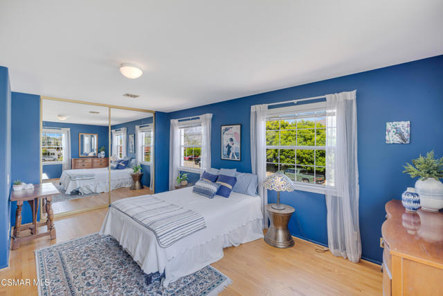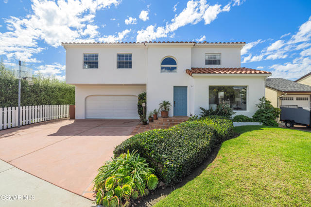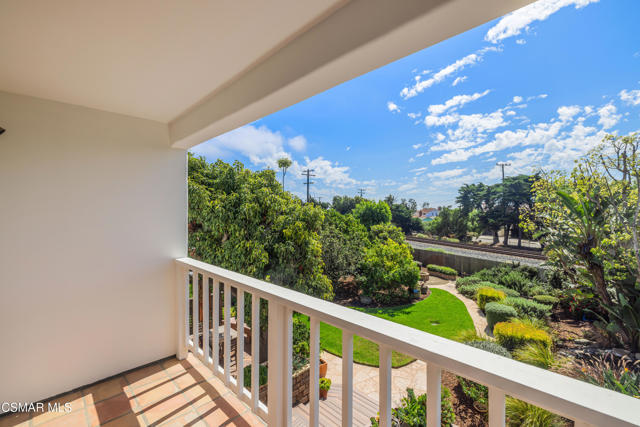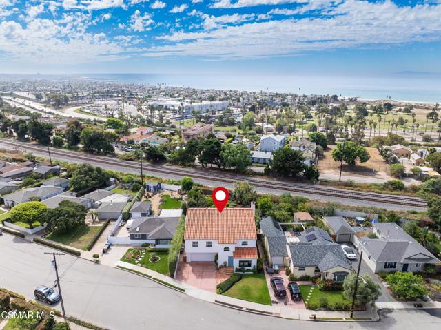 Live near the Sun and Surf like a dream come true. Striking Spanish Revival inspired Ventura coast home, originally built in 1949 and re-built new in the late 1980's. Offering approximately 3,001 square feet across two levels, this residence combines timeless character with modern comforts. The main floor features a spacious den or office with a full bath, a formal living room with a large picture window, and a generous kitchen designed to gather everyone in the heart of the home. Kitchen highlights include a charming fireplace, commercial grade stove with griddle, ample cabinetry, extensive counter space, and multiple windows and French doors that open to the verdant backyard. With the fire glowing and conversations flowing onto the patio, this kitchen is an entertainer's dream. A dramatic staircase leads to the upstairs bedrooms, all filled with natural light. Three bedrooms share a well appointed hall bath with dual sinks and a full tub shower. One whimsical bedroom features a loft with a picture window, sparking the imagination. The dramatic primary suite offers soaring ceilings, a massive walk in closet, and a private study or office with its own brick fireplace. Step out onto the balcony and enjoy views of the lush garden below and, on clear days, the sparkling Pacific Ocean. Located near the historic coastal railway line passing 4 times daily, this home offers convenience and charm without heavy freight traffic. The trains pass quickly typically under 30 seconds. Additional features include a three car tandem garage with cabinetry, an indoor laundry room, and a backyard designed for both beauty and ease of living. Multiple seating areas, a water feature, a gas fire pit, citrus trees, and an easy care deck create a magical outdoor setting. This remarkable property invites you to immerse yourself in coastal living, with the beautiful beach less than a mile away.