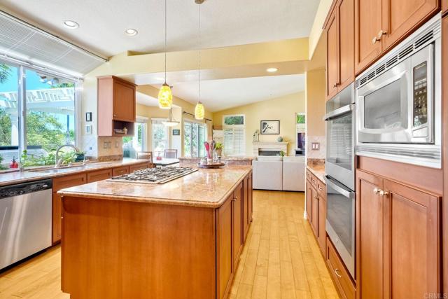 Elegant Single-Story with Scenic Views in Shadowridge Set on a generous 0.65-acre lot, this beautifully remodeled, move-in-ready home offers the perfect blend of luxury, comfort, and picturesque charm. Located in the highly desirable Shadowridge community, the property showcases expansive panoramic views and a thoughtfully designed open-concept layout with vaulted ceilings, French doors, and large windows that bathe the interior in natural light. The heart of the home is the gourmet chef’s kitchen, featuring custom cabinetry with pull-outs, granite countertops, stainless steel appliances, a double oven, warming drawer, built-in microwave, gas cooktop, and a spacious center island with breakfast bar—ideal for entertaining or casual dining. The open living, dining, and family rooms create a seamless indoor-outdoor flow and overlook the lush backyard landscape. The private primary suite is a true retreat, with French doors leading to the serene yard, a custom-built closet system, and a luxurious en suite bath adorned with high-end finishes. Two oversized secondary bedrooms offer exceptional space and comfort, complemented by two stylishly updated full bathrooms. Step outside to your own backyard oasis—complete with two Alumawood patio covers, an adjustable shade structure, tranquil fountain, and a built-in natural gas BBQ island—all set against stunning sunset views. The expansive lower yard features a variety of fruit trees, including lemon, orange, avocado, apple, plum, and pear. Additional features include engineered hardwood flooring throughout, a newer A/C and furnace, a brand-new water heater, and an oversized three-car garage. Enjoy access to nearby pickleball, tennis, and basketball courts, as well as scenic nature trails—all just a short walk away. This rare gem has it all: scenic views, premium updates, and an unbeatable location. Schedule your private showing today!