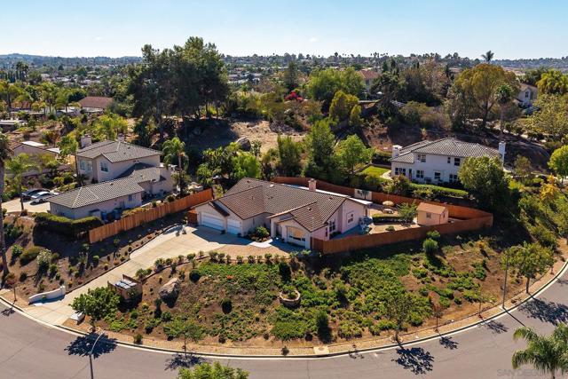 This comfortable & private single level home sits high above street, on over 1/2 acre showcasing mesmerizing panoramic views of tropical scenery & beautiful green hills. Lots of natural light fills this 4 Br, 3 bath home. Great room with fireplace, multiple expansive patio & yard areas. Open floor plan, vaulted ceilings. Primary suite w. its own entrance, French doors allow easy separation of kitchen & living room. Wood vinyl flooring throughout Roomy 3- car garage with tons of storage. *SEE SUPPLEMENT Wide hallways lead to large private primary suite, with its own entry & private enclosed patio, spacious bath w. dual sinks, separate shower and soaking tub. Colorful succulent easy-care landscaping with a brand new sprinkler system. Property has newer fencing around 3/4 of lot with 2 large gates. Roomy 3- car garage with epoxy flooring and cabinets/storage galore, besides separate storage shed at rear yard. Newly painted exterior. New water heater. Central A/C . *Property extends beyond fences. *Room for multiple cars in driveway, & RV, Boat parking*4th bedroom is a den which easily converts. * Primary suite could become a convenient guest home/ADU, as it has its own entrance & enclosed patio. Just a few minutes to shopping, restaurants, beautiful neighborhood parks, acclaimed schools, nearby museum, great restaurants including Famous Texas BBQ, & some of Southern California’s most beautiful beaches: Oceanside & Carlsbad.