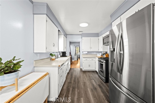 Charming 2bd/1ba home on an oversized corner lot WITH A/C!! Enter from the large front porch into the bright living area bathed in natural light that flows seamlessly into the formal dining room. The kitchen boasts new vinyl floors throughout with a breakfast nook. Enjoy a separate indoor laundry room located conveniently off the kitchen. The two spacious bedrooms have plenty of closet space, with the bathroom centrally located between both rooms. The backyard features a large cemented area and a small side yard. The detached 2-car garage + carport offers plenty of room for parking, storage, a workshop, or even a potential ADU for multi-generational living or rental income. The long driveway fits multiple cars, RV, or toys. This home is move-in ready and has over $55K in updates, including a new roof, A/C, electrical, plumbing with copper pipes, energy-efficient windows, interior paint, and is smart home ready. Within walking distance to local schools and ideally situated close to shopping & commuter routes!
