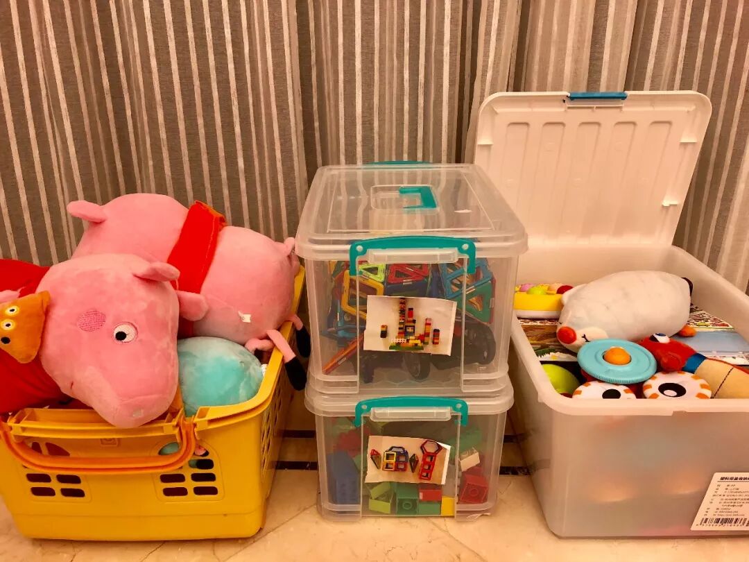 完成第一步之后,再把剩下的玩具中娃已经不玩的玩具挑出来,分为三类:一类是有纪念意义想自己留着的,先放一边;一类就是品相还不错,直接拍完照装箱子里,整理完后挂二手;剩下的玩具,用事先准备好的收纳筐装起来。