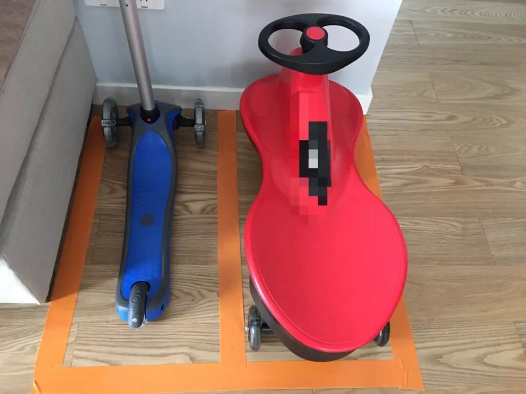 然后用布基胶带在地板上划了几个“车位”,娃的玩具车、滑板车、扭扭车都可以停在里面。