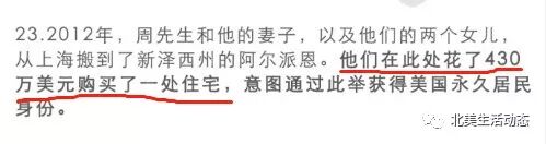 第23条显示,2012年,周立波和胡洁以及他的两个女儿从上海搬到新泽西(专题)阿尔派恩。他们在此处花430万美元置入豪宅(折合人民币约2916万元),莫虎表示,周立波购买此处房产的目的是获得美国永久居民身份。
