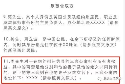 莫虎诉讼状第11条中称:周立波在纽约州纽约县一共有三套公寓,其中两套是周立波分别与胡洁及继女共同持有,剩下的第三套则在胡洁及其继女名下。莫虎并未说明该三套公寓何时购入。