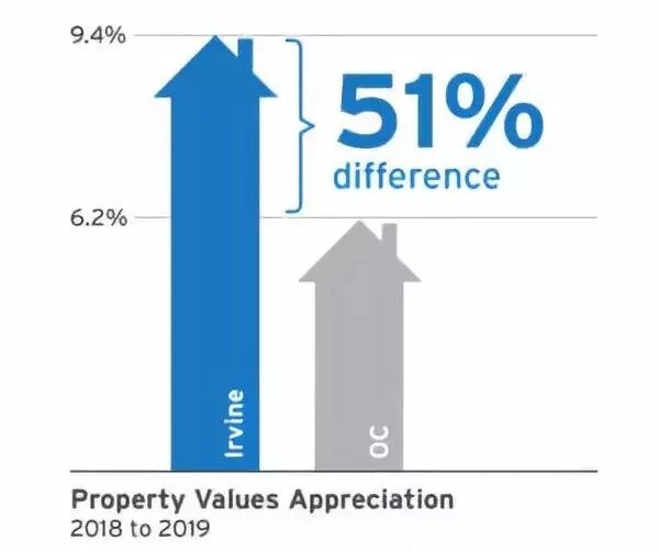 2018年至2019年间,橘郡的平均房价增长了6.2%,打个比方,去年一套价值50万美金的房产,今年涨到了531,150美金,但如果这套房产地处尔湾,今年的的价格就是547,150美金,也就是说,尔湾的房价升值速度整整领先了51%!增加的房屋价值也为尔湾带来了可观的税收收入,用以维持尔湾的警察局、公园以及城市开放空间的建设,这使得尔湾的市政设施和安全性都达到了全国顶级水平。