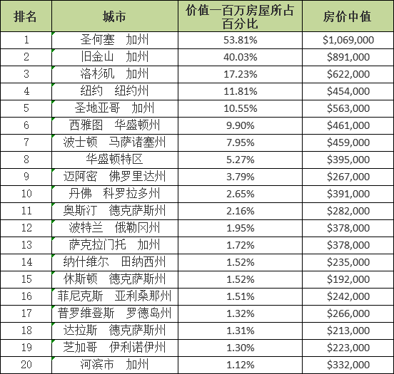 以下这20个美国城市的住房存量至少有1%超过100万美元: