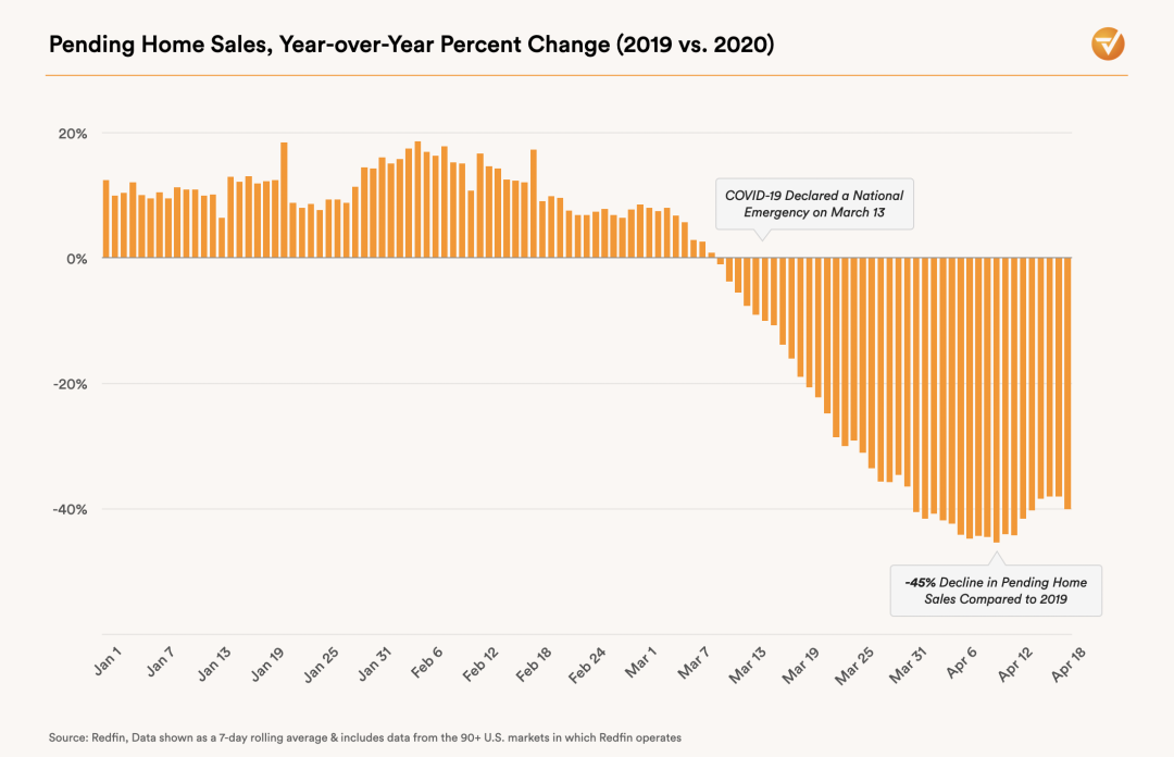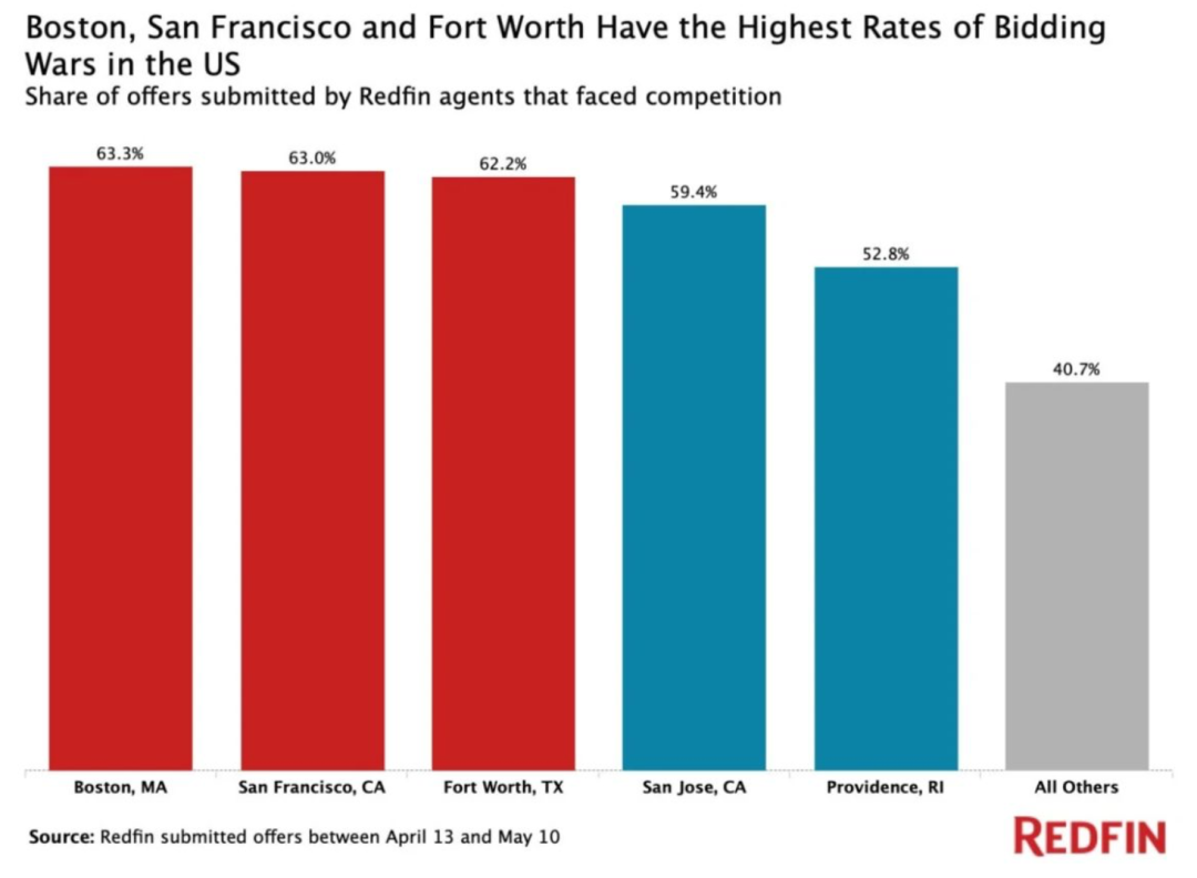 新冠病毒爆发后,很多购房这者因为丢了工作,失去了购买的能力。还有很多购房者即便拥有购买能力,但因为疫情的爆发也对买房持观望态度。从许多指标来看,美国人的购房需求明显下降。通常,需求的大幅下降会给价格带来下行压力。但也正是因为疫情的原因,住房供应也随之下降。因为潜在的房屋卖家出于许多与买家相同的原因撤出了市场。据美国两大房地产信息网站之一的Redfin称,在4月和5月间有41%的报价遭遇竞购战(bidding war),暗示房市供不应求。