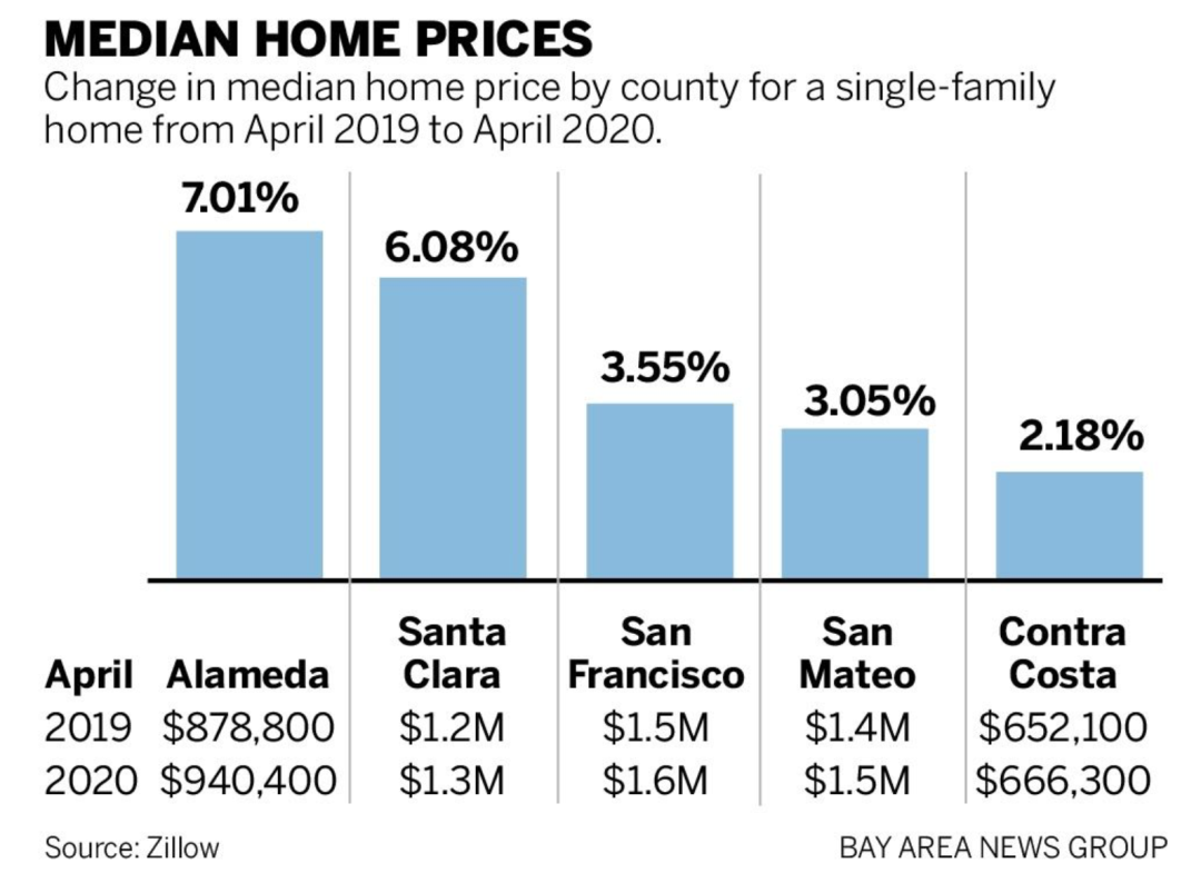 根据Zillow的分析,硅谷(Silicon Valley)和东湾(East Bay)的七个核心县的销售价格中值有所上升。与去年4月相比,Alameda County和Santa Clara County的房价分别上涨了7%和6%。4月份湾区单户住宅的售价中值为89.6万美元。由于待售房屋减少,买家抢购的速度堪比2018年房地产繁荣的巅峰时期。Zillow分析师Jeff Tucker称:"房价在疫情期间保持坚挺,尤其是独栋房屋(single-family homes)。" 加上湾区经济相对强劲,受科技因素推动,房屋库存紧张,利率处于历史低位等因素的影响,导致了湾区房价在疫情期间的上涨。