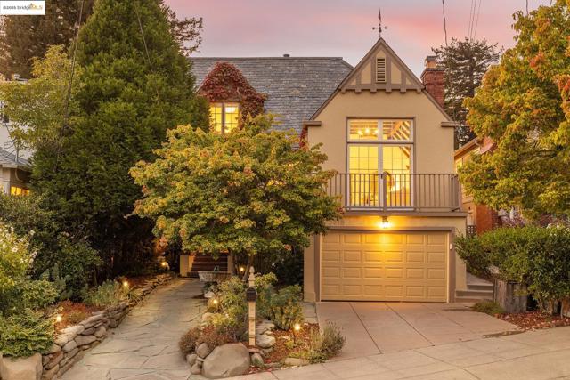 This romantic Tudor home blends true elegance with striking modern design. The grand living room boasts vaulted ceilings, exposed beams, French doors to a sweet balcony, and hardwood floors that flow throughout. A gorgeously remodeled eat-in kitchen features quartz counters, herringbone backsplash, modern blue cabinetry, Viking and Bosch appliances and unique lighting. Enjoy seamless indoor-outdoor flow from the kitchen to a gorgeous two-level terraced backyard with flagstone patio and a flat upper yard for al fresco dining, play, or gardening. Conveniently located on the main level is one bedroom and a stylish bathroom. Upstairs, the primary suite offers a large walk-in closet and sunroom ideal for a home office or art room. On this level you will also find another bedroom and an updated bath with subway tile and deep tub. Bonus space downstairs - ideal for a media room - and a laundry room, measuring an additional 366 sq ft. Attached garage, interior access! Wonderful updates: Tesla charger, 200 amp electrical service, sewer compliant, newer water heater. Top-notch schools like Hillcrest, Aurora and St Theresa moments away. Local parks, College Ave & Montclair shops, cafés, and restaurants and access to highway/transport are all close-by.