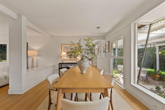 Nestled at the end of a quiet cul-de-sac, this single-level mid-century home offers privacy, sunshine, and nearly 15,000 sqft of level and usable land. This incredible home blends timeless style with modern updates including fresh paint, new LVP flooring, and updated lighting. Inside, an open living-dining area creates easy flow for gatherings, while 4 bedrooms and 3 baths provide flexible space for family and friends to make memories of a lifetime. Large windows invite natural light and views of mature oaks, redwoods, and fruit trees into your daily experience. The expansive yard offers room to relax, play, or entertain in the "my secret garden" setting with natures soundtrack. Ideally situated between Redwood City and San Carlos, this beauty delivers the rare combination of mid-century charm, single-level living, and a generous private lot, all within walking distance to the best living offered on the peninsula!