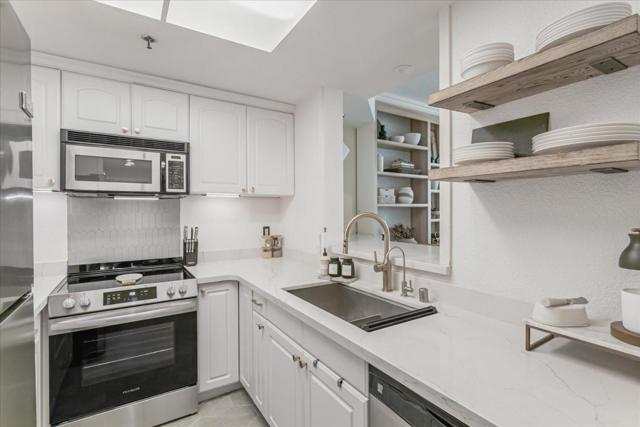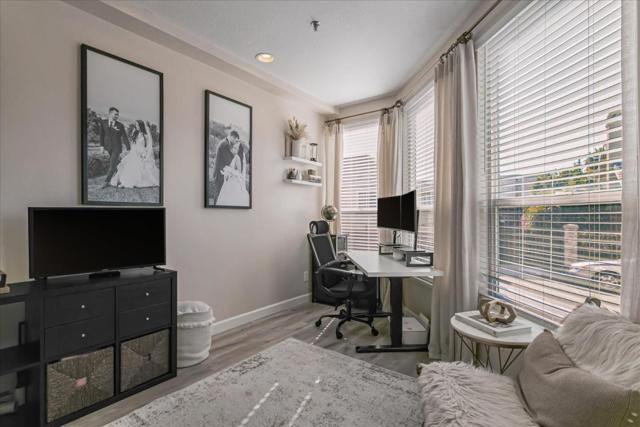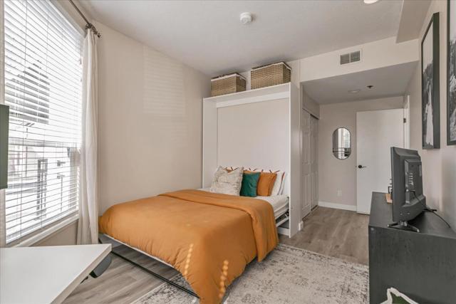 This beautifully updated home, an end unit, features a modern kitchen with newly installed floor tiles and quartz counter tops, along with renovated bathroom floor tile and vanities - all professionally done within the last 2 years. Enjoy the convenience of an assigned garage parking spot right near the elevator and garage door, plus private street parking (just register your vehicle with the city) and additional parking in adjacent lots. Located within walking distance to SAP Center and San Pedro Square, and just across the street from a dog park, this home offers an ideal location for work, play and relaxation. With easy access to Highways 280 and 87, as well as Caltrain and VTA stations, commuting is a breeze. The south facing windows provide an abundance of natural light all day long, and the direct street access to your front door eliminates the hassle of elevators or access keys. Additional amenities include secure lock mailboxes and parcel lockers, a gym room, event space, central AC and heating, a newer stainless steel sink, oven and fresh paint throughout.